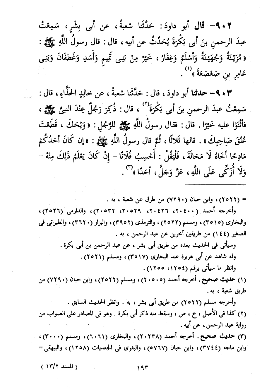 903 - حَدَّثَنَا أَبُو دَاوُدَ قَالَ: حَدَّثَنَا شُعْبَةُ، عَنْ خَالِدٍ الْحَذَّاءِ، قَالَ: سَمِعْتُ عَبْدَ الرَّحْمَنِ بْنَ أَبِي بَكْرَةَ، قَالَ: ذُكِرَ رَجُلٌ عِنْدَ النَّبِيِّ صَلَّى اللهُ عَلَيْهِ وَسَلَّمَ فَأَثْنَوْا عَلَيْهِ خَيْرًا قَالَ: فَقَالَ رَسُولُ اللَّهِ صَلَّى اللهُ عَلَيْهِ وَسَلَّمَ لِلرَّجُلِ: وَيْحَكَ قَطَعْتَ عُنُقَ صَاحِبِكَ قَالَهَا ثَلَاثًا ثُمَّ قَالَ رَسُولُ اللَّهِ صَلَّى اللهُ عَلَيْهِ وَسَلَّمَ: «§إِنْ كَانَ أَحَدُكُمْ مَادِحًا أَخَاهُ لَا مَحَالَةَ فَلْيَقُلْ أَحْسَبُ فُلَانًا إِنْ كَانَ يَعْلَمُ ذَلِكَ مِنْهُ وَلَا أُزَكِّي عَلَى اللَّهِ عَزَّ وَجَلَّ أَحَدًا»
