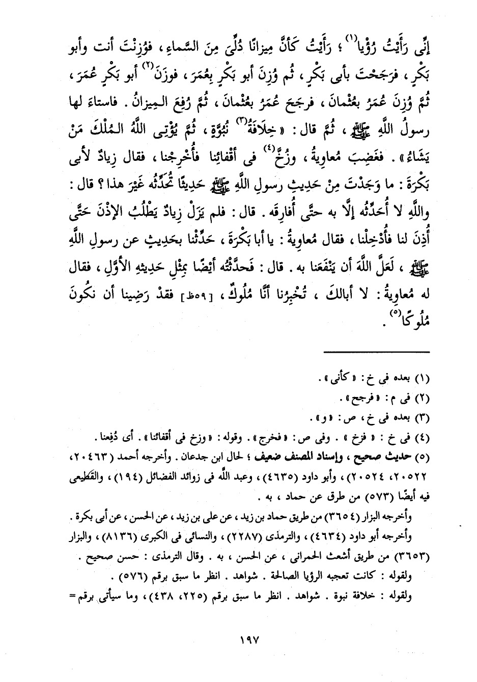 ثُمَّ رُفِعَ الْمِيزَانُ، فَاسْتَاءَ لَهَا رَسُولُ اللهِ صَلَّى الله عَلَيْهِ وَسَلَّمَ ثُمَّ قَالَ: خِلاَفَةُ نُبُوَّةٍ ثُمَّ يُؤْتِي اللهُ الْمُلْكَ مَنْ يَشَاءُ، فَغَضِبَ مُعَاوِيَةُ وَزُخَّ فِي أَقْفَائِنَا فَأُخْرِجْنَا، فَقَالَ زِيَادٌ لأَبِي بَكْرَةَ: مَا وَجَدْتَ مِنْ حَدِيثِ رَسُولِ اللهِ صَلَّى الله عَلَيْهِ وَسَلَّمَ حَدِيثًا تُحَدِّثُهُ غَيْرَ هَذَا؟ قَالَ: وَاللهِ لاَ أُحَدِّثُهُ إِلاَّ بِهِ حَتَّى أُفَارِقَهُ، قَالَ: فَلَمْ يَزَلْ زِيَادٌ يَطْلُبُ الإِذْنَ حَتَّى أُذِنَ لَنَا فَأُدْخِلْنَا، فَقَالَ مُعَاوِيَةُ: يَا أَبَا بَكْرَةَ حَدِّثْنَا بِحَدِيثٍ عَنْ رَسُولِ اللهِ صَلَّى الله عَلَيْهِ وَسَلَّمَ لَعَلَّ اللَّهَ أَنْ يَنْفَعَنَا بِهِ، قَالَ: فَحَدَّثْتُهُ أَيْضًا بِمِثْلِ حَدِيثِهِ الأَوَّلِ، فَقَالَ لَهُ مُعَاوِيَةُ: لاَ أَبَا لَكَ تُخْبِرُنَا أَنَّا مُلُوكٌ فَقَدْ رَضِينَا أَنْ نَكُونَ مُلُوكًا.