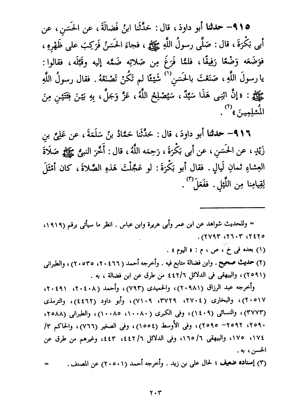 915 - حَدَّثَنَا أَبُو دَاوُدَ قَالَ: حَدَّثَنَا ابْنُ فَضَالَةَ، عَنِ الْحَسَنِ، عَنْ أَبِي بَكْرَةَ، قَالَ: صَلَّى رَسُولُ اللَّهِ صَلَّى اللهُ عَلَيْهِ وَسَلَّمَ فَجَاءَ الْحَسَنُ فَرَكِبَ عَلَى ظَهْرِهِ فَوَضَعَهُ وَضْعًا رَفِيقًا فَلَمَّا فَرَغَ مِنْ صَلَاتِهِ ضَمَّهُ إِلَيْهِ وَقَبَّلَهُ فَقَالُوا: يَا رَسُولَ اللَّهِ، صَنَعْتَ بِالْحَسَنِ شَيْئًا لَمْ تَكُنْ تَصْنَعُهُ فَقَالَ رَسُولُ اللَّهِ صَلَّى اللهُ عَلَيْهِ وَسَلَّمَ: «إِنَّ §ابْنِي هَذَا سَيِّدٌ سَيُصْلِحُ اللَّهُ عَزَّ وَجَلَّ بِهِ بَيْنَ فِئَتَيْنِ مِنَ الْمُسْلِمِينَ»