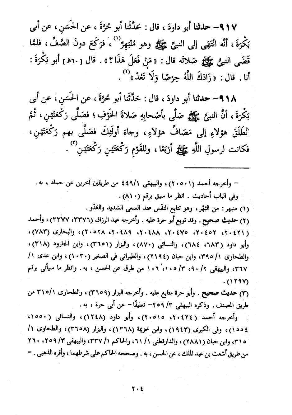 917 - حَدَّثَنَا أَبُو دَاوُدَ قَالَ: حَدَّثَنَا أَبُو حُرَّةَ، عَنِ الْحَسَنِ، عَنْ أَبِي بَكْرَةَ، أَنَّهُ " انْتَهَى إِلَى النَّبِيِّ صَلَّى اللهُ عَلَيْهِ وَسَلَّمَ وَهُوَ مُنْبَهِرٌ فَرَكَعَ دُونَ الصَّفِّ فَلَمَّا قَضَى النَّبِيُّ صَلَّى اللهُ عَلَيْهِ وَسَلَّمَ صَلَاتَهُ قَالَ: «مَنْ فَعَلَ هَذَا؟» قَالَ أَبُو بَكْرَةَ: أَنَا قَالَ: «§زَادَكَ اللَّهُ حِرْصًا وَلَا تَعُدْ»