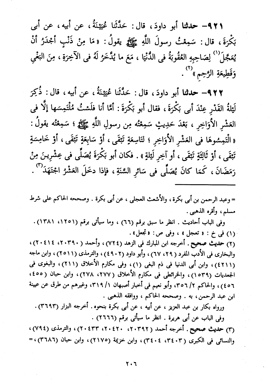 921 - حَدَّثَنَا أَبُو دَاوُدَ قَالَ: حَدَّثَنَا عُيَيْنَةُ، عَنْ أَبِيهِ، عَنْ أَبِي بَكْرَةَ، قَالَ: سَمِعْتُ رَسُولَ اللَّهِ صَلَّى اللهُ عَلَيْهِ وَسَلَّمَ يَقُولُ: «§مَا مِنْ ذَنْبٍ أَجْدَرُ أَنْ يُعَجَّلَ لِصَاحِبِهِ الْعُقُوبَةُ فِي الدُّنْيَا مَعَ مَا يُدَّخَرُ لَهُ فِي الْآخِرَةِ مِنَ الْبَغْيِ وَقَطِيعَةِ الرَّحِمِ»