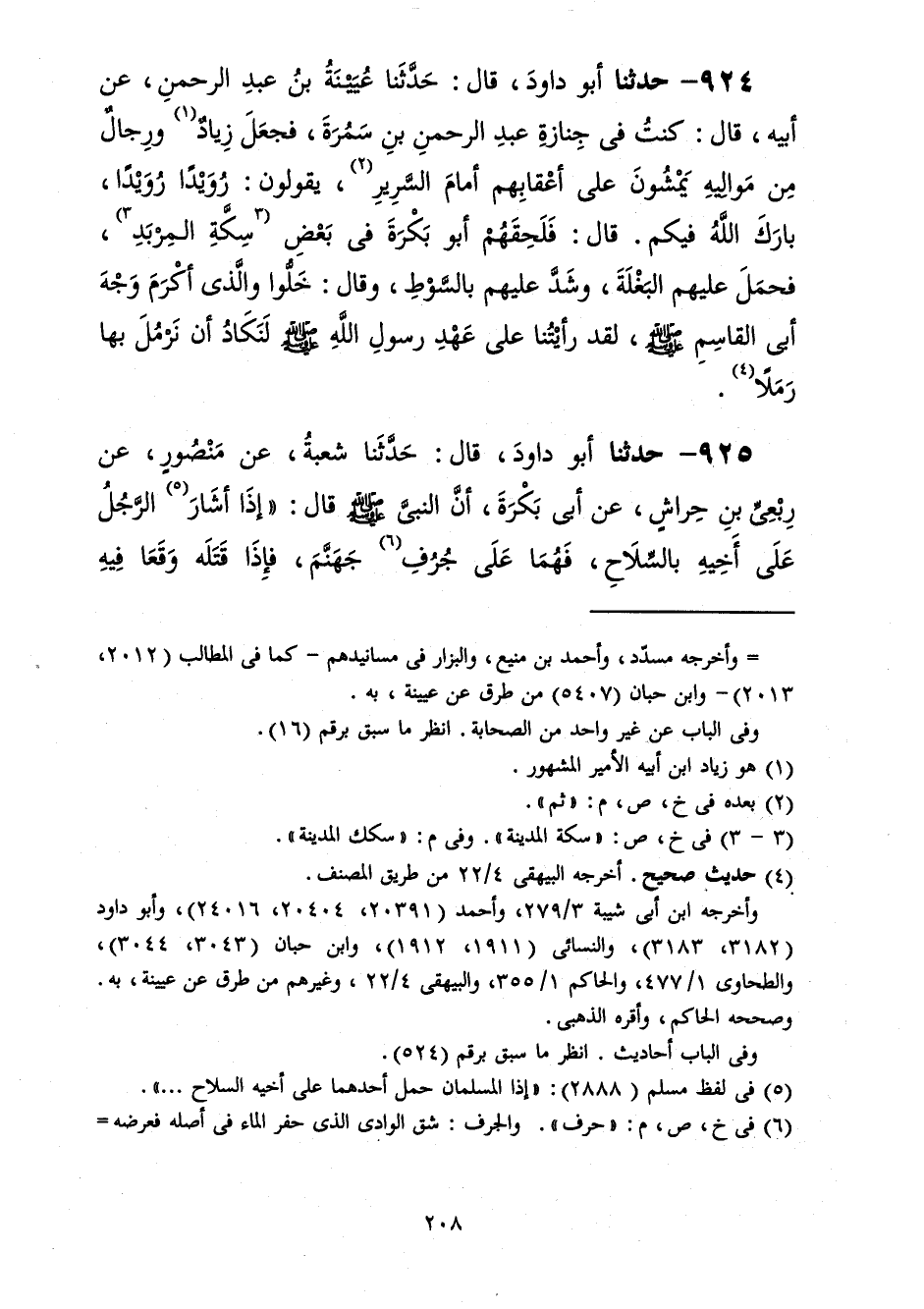 925 - حَدَّثَنَا أَبُو دَاوُدَ قَالَ: حَدَّثَنَا شُعْبَةُ، عَنْ مَنْصُورٍ، عَنْ رِبْعِيِّ بْنِ حِرَاشٍ، عَنْ أَبِي بَكْرَةَ، أَنَّ النَّبِيَّ صَلَّى اللهُ عَلَيْهِ وَسَلَّمَ قَالَ: «§إِذَا أَشَارَ الرَّجُلُ عَلَى أَخِيهِ بِالسِّلَاحِ فَهُمَا عَلَى جُرُفِ جَهَنَّمَ فَإِذَا قَتَلَهُ وَقَعَا فِيهِ -[209]- جَمِيعًا»