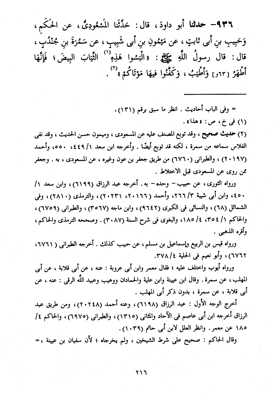936 - حَدَّثَنَا أَبُو دَاوُدَ قَالَ: حَدَّثَنَا الْمَسْعُودِيُّ، عَنِ الْحَكَمِ، وَحَبِيبِ بْنِ أَبِي ثَابِتٍ، عَنْ مَيْمُونِ بْنِ أَبِي شَبِيبٍ، عَنْ سَمُرَةَ بْنِ جُنْدَبٍ، قَالَ: قَالَ رَسُولُ اللَّهِ صَلَّى اللهُ عَلَيْهِ وَسَلَّمَ: «§الْبَسُوا هَذِهِ الثِّيَابَ الْبِيضَ فَإِنَّهَا أَطْهَرُ وَأَطْيَبُ وَكَفِّنُوا فِيهَا مَوْتَاكُمْ»