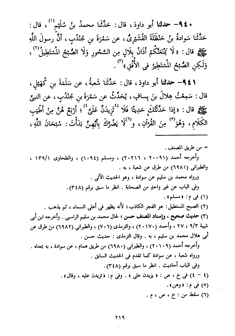940 - حَدَّثَنَا أَبُو دَاوُدَ قَالَ: حَدَّثَنَا مُحَمَّدُ بْنُ سُلَيْمٍ، قَالَ: حَدَّثَنَا سَوَادَةُ بْنُ حَنْظَلَةَ الْقُشَيْرِيُّ، عَنْ سَمُرَةَ بْنِ جُنْدَبٍ، أَنَّ رَسُولَ اللَّهِ صَلَّى اللهُ عَلَيْهِ وَسَلَّمَ قَالَ: «§لَا يَمْنَعَنَّكُمْ أَذَانُ بِلَالٍ مِنَ السَّحُورِ وَلَا الصُّبْحُ الْمُسْتَطِيلُ وَلَكِنِ الصُّبْحُ الْمُسْتَطِيرُ فِي الْأُفُقِ»