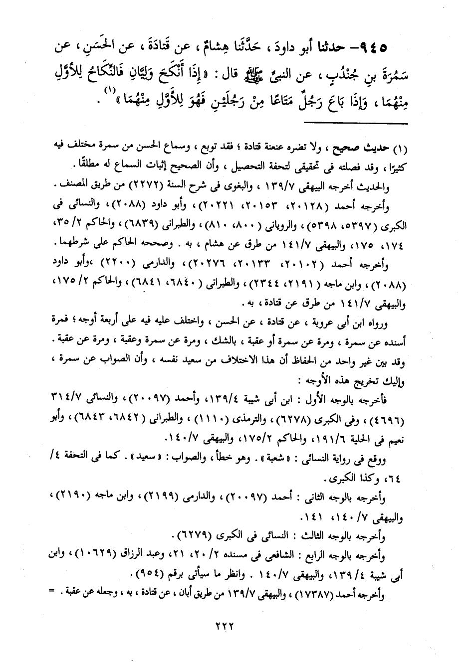 945 - حَدَّثَنَا أَبُو دَاوُدَ قَالَ: حَدَّثَنَا هِشَامٌ، عَنْ قَتَادَةَ، عَنِ الْحَسَنِ، عَنْ سَمُرَةَ بْنِ جُنْدَبٍ، عَنِ النَّبِيِّ صَلَّى اللهُ عَلَيْهِ وَسَلَّمَ قَالَ: «§إِذَا أَنْكَحَ وَلِيَّانِ فَالنِّكَاحُ لِلْأَوَّلِ مِنْهُمَا، وَإِذَا بَاعَ رَجُلٌ مَتَاعًا مِنْ رَجُلَيْنِ فَهُوَ لِلْأَوَّلِ مِنْهُمَا»