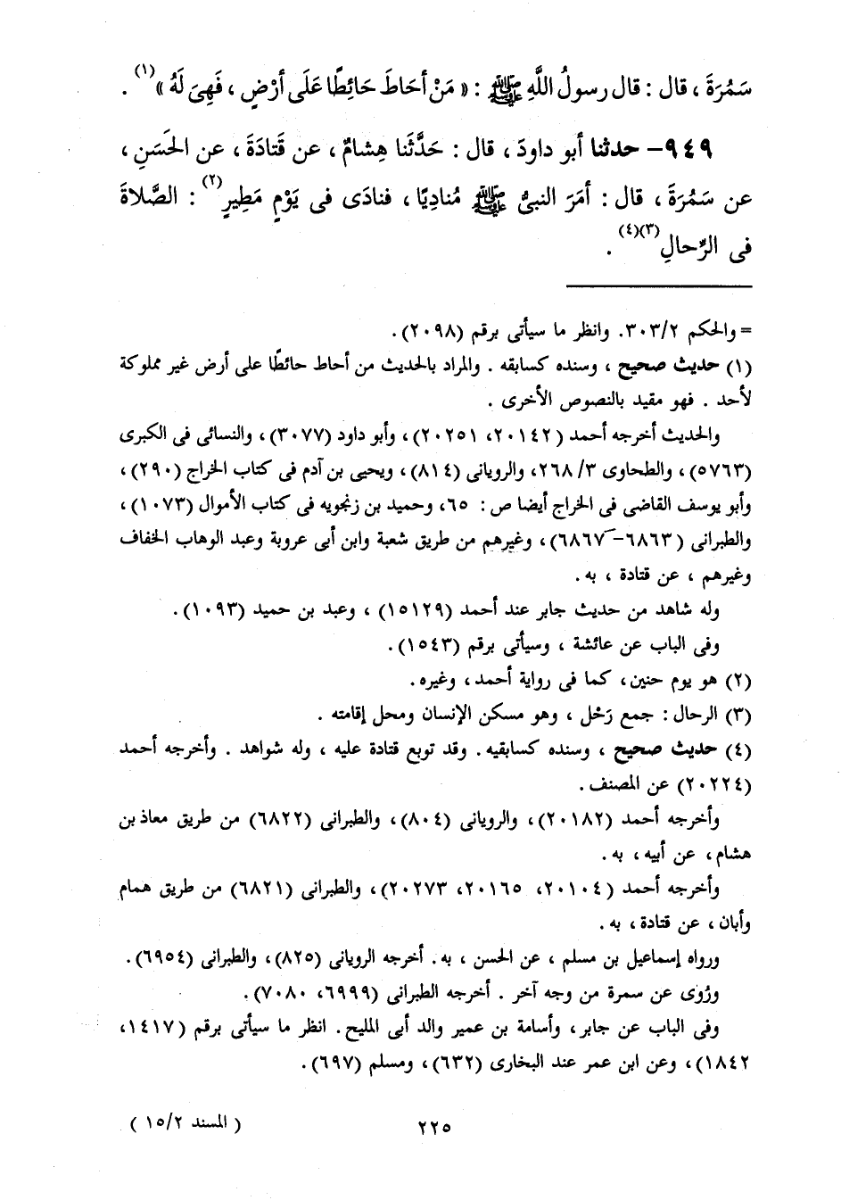949 - حَدَّثَنَا أَبُو دَاوُدَ قَالَ: حَدَّثَنَا هِشَامٌ، عَنْ قَتَادَةَ، عَنِ الْحَسَنِ، عَنْ سَمُرَةَ، قَالَ: أَمَرَ النَّبِيُّ صَلَّى اللهُ عَلَيْهِ وَسَلَّمَ مُنَادِيًا فَنَادَى فِي يَوْمٍ مَطِيرٍ: «§الصَّلَاةَ فِي الرِّحَالِ»