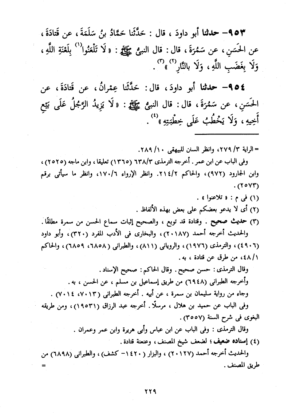953 - حَدَّثَنَا أَبُو دَاوُدَ قَالَ: حَدَّثَنَا حَمَّادُ بْنُ سَلَمَةَ، عَنْ قَتَادَةَ، عَنِ الْحَسَنِ، عَنْ سَمُرَةَ، قَالَ: قَالَ النَّبِيُّ صَلَّى اللهُ عَلَيْهِ وَسَلَّمَ: «§لَا تَلْعَنُوا بِلَعْنَةِ اللَّهِ وَلَا بِغَضَبِ اللَّهِ وَلَا بِالنَّارِ»