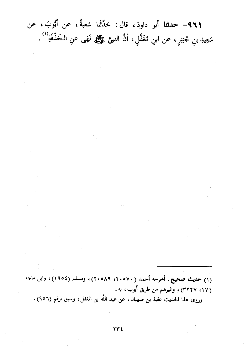 961 - حَدَّثَنَا أَبُو دَاوُدَ قَالَ: حَدَّثَنَا شُعْبَةُ، عَنْ أَيُّوبَ، عَنْ سَعِيدِ بْنِ جُبَيْرٍ، عَنِ ابْنِ مُغَفَّلٍ، أَنَّ النَّبِيَّ صَلَّى اللهُ عَلَيْهِ وَسَلَّمَ «§نَهَى عَنِ الْخَذْفَةِ»