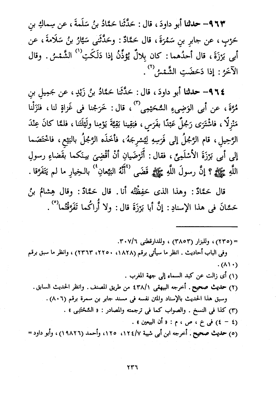 964 - حَدَّثَنَا أَبُو دَاوُدَ قَالَ: حَدَّثَنَا حَمَّادُ بْنُ زَيْدٍ، عَنْ جَمِيلِ بْنِ مُرَّةَ، عَنْ أَبِي الْوَضِيءِ السَّحْتَنِيِّ، قَالَ: خَرَجْنَا فِي غَزَاةٍ لَنَا فَنَزَلْنَا مَنْزِلًا فَاشْتَرَى رَجُلٌ عَبْدًا بِفَرَسٍ فَبَقِينَا بَقِيَّةَ يَوْمِنَا وَلَيْلَتِنَا فَلَمَّا كَانَ عِنْدَ الرَّحِيلِ قَامَ الرَّجُلُ إِلَى فَرَسِهِ لِيُسْرِجَهُ فَأَخَذَهُ الرَّجُلُ بِالْبَيْعِ فَاخْتَصَمَا إِلَى أَبِي بَرْزَةَ الْأَسْلَمِيِّ فَقَالَ: أَتَرْضَيَانِ أَنْ أَقْضِيَ بَيْنَكُمَا بِقَضَاءِ رَسُولِ اللَّهِ صَلَّى اللهُ عَلَيْهِ وَسَلَّمَ «إِنَّ رَسُولِ اللَّهِ صَلَّى اللهُ عَلَيْهِ وَسَلَّمَ قَضَى أَنَّهُ §الْبَيِّعَانِ بِالْخِيَارِ مَا لَمْ يَتَفَرَّقَا» قَالَ حَمَّادٌ: وَهَذَا الَّذِي حَفِظْتُهُ أَنَا قَالَ حَمَّادٌ: وَقَالَ هِشَامُ بْنُ حَسَّانَ فِي هَذَا الْإِسْنَادِ: أَنَّ أَبَا بَرْزَةَ قَالَ: وَلَا أُرَاكُمَا تَفَرَّقْتُمَا