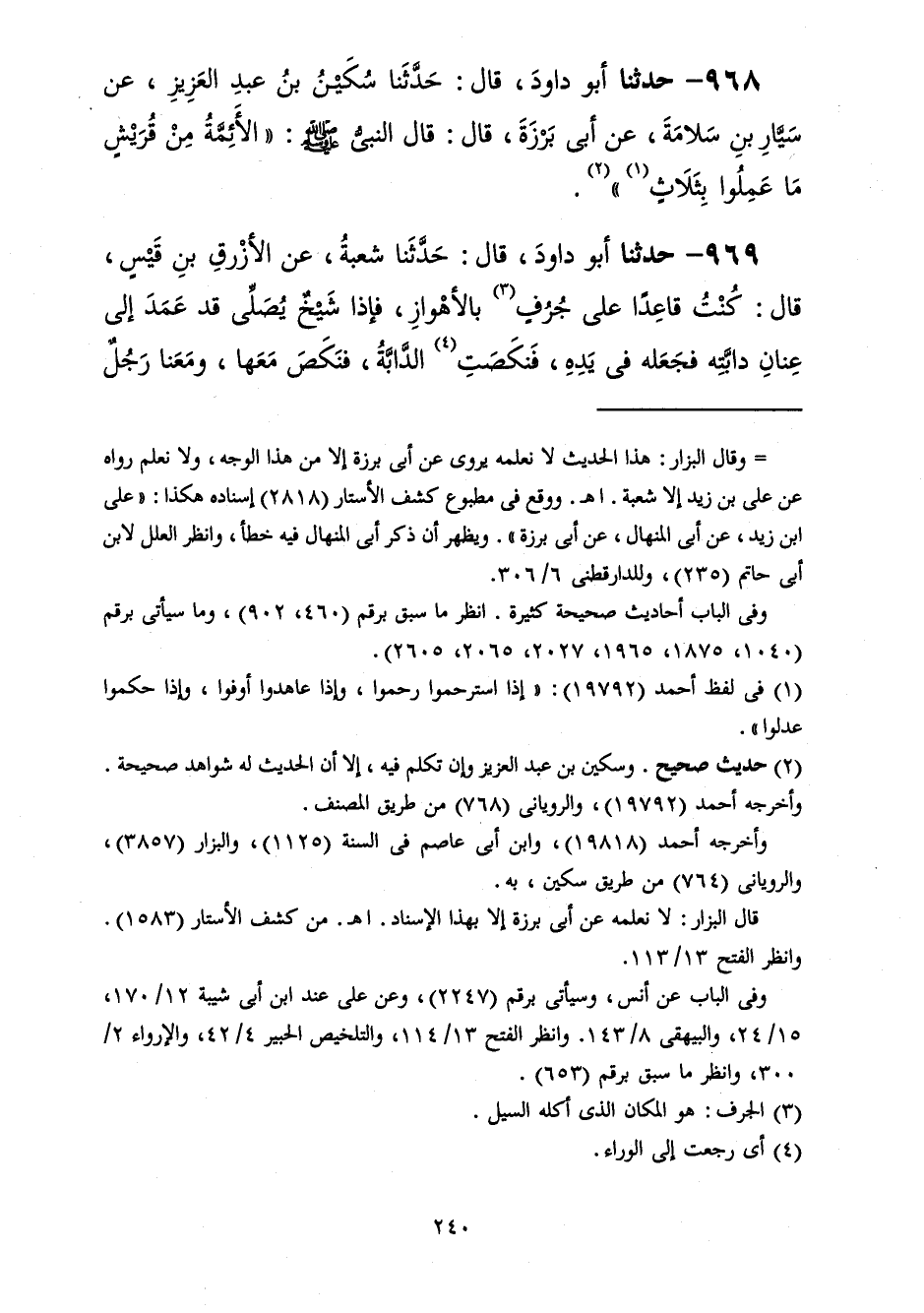 968 - حَدَّثَنَا أَبُو دَاوُدَ قَالَ: حَدَّثَنَا سُكَيْنُ بْنُ عَبْدِ الْعَزِيزِ، عَنْ سَيَّارِ بْنِ سَلَامَةَ، عَنْ أَبِي بَرْزَةَ، قَالَ: قَالَ النَّبِيُّ صَلَّى اللهُ عَلَيْهِ وَسَلَّمَ: «§الْأَئِمَّةُ مِنْ قُرَيْشٍ مَا عَمِلُوا بِثَلَاثٍ»