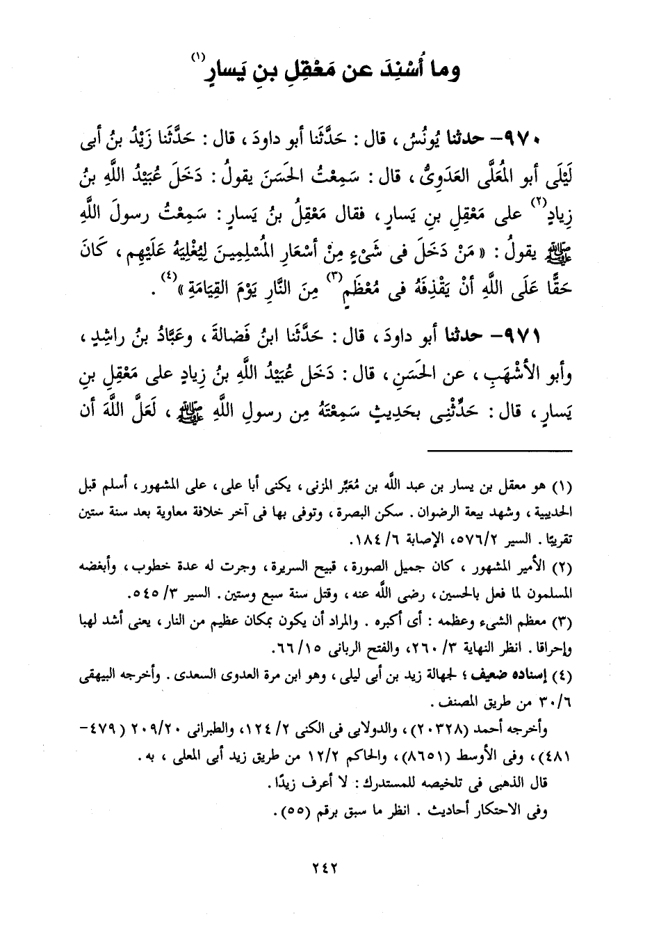 971 - حَدَّثَنَا أَبُو دَاوُدَ قَالَ: حَدَّثَنَا ابْنُ فَضَالَةَ، وَعَبَّادُ بْنُ رَاشِدٍ، وَأَبُو الْأَشْهَبِ، عَنِ الْحَسَنِ، قَالَ: دَخَلَ عُبَيْدُ اللَّهِ بْنُ زِيَادٍ عَلَى مَعْقِلِ بْنِ يَسَارٍ قَالَ: حَدِّثْنِي بِحَدِيثٍ سَمِعْتَهُ مِنْ رَسُولِ اللَّهِ صَلَّى اللهُ عَلَيْهِ وَسَلَّمَ لَعَلَّ اللَّهَ أَنْ -[243]- يَنْفَعَنِيَ بِهِ قَالَ: سَمِعْتُ رَسُولَ اللَّهِ صَلَّى اللهُ عَلَيْهِ وَسَلَّمَ يَقُولُ: «§مَنِ اسْتُرْعِيَ رَعِيَّةً فَمَاتَ وَهُوَ لَهَا غَاشٌّ حَرَّمَ اللَّهُ عَلَيْهِ الْجَنَّةَ»