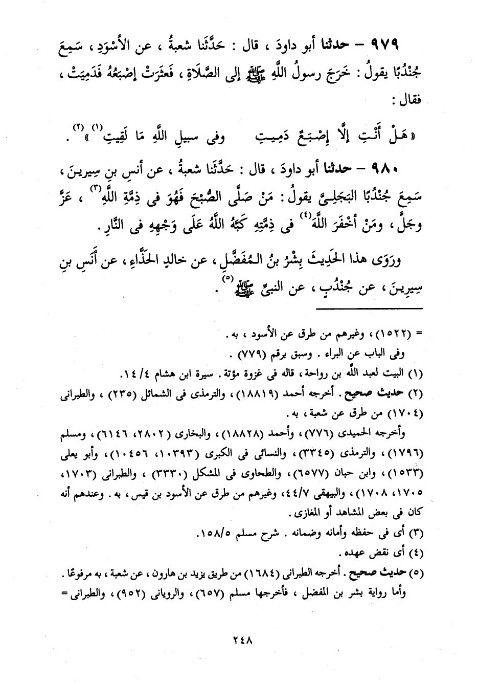 980 - حَدَّثَنَا أَبُو دَاوُدَ قَالَ: حَدَّثَنَا شُعْبَةُ، عَنْ أَنَسِ بْنِ سِيرِينَ، سَمِعَ جُنْدُبًا الْبَجَلِيَّ، يَقُولُ: «§مَنْ صَلَّى الصُّبْحَ فَهُوَ فِي ذِمَّةِ اللَّهِ عَزَّ وَجَلَّ، وَمَنْ أَخْفَرَ اللَّهَ فِي ذِمَّتِهِ كَبَّهُ اللَّهُ عَلَى وَجْهِهِ فِي النَّارِ» وَرَوَى هَذَا الْحَدِيثَ بِشْرُ بْنُ الْمُفَضَّلِ عَنْ خَالِدٍ الْحَذَّاءِ عَنِ أَنَسِ بْنِ سِيرِينَ عَنْ جُنْدُبٍ عَنِ النَّبِيِّ صَلَّى اللهُ عَلَيْهِ وَسَلَّمَ