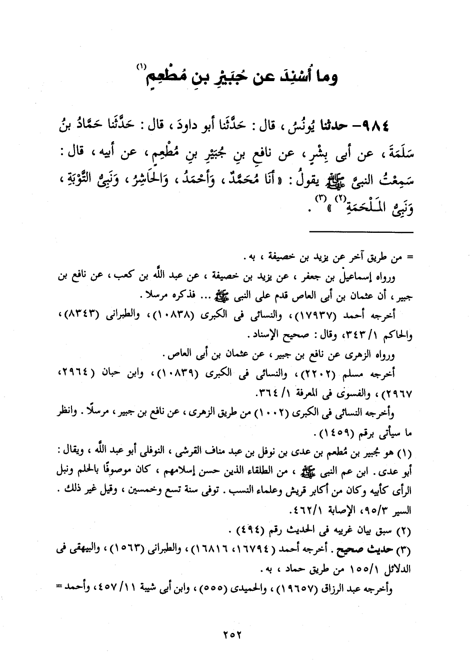 984 - حَدَّثَنَا يُونُسُ قَالَ: حَدَّثَنَا أَبُو دَاوُدَ قَالَ: حَدَّثَنَا حَمَّادُ بْنُ سَلَمَةَ، عَنْ أَبِي بِشْرٍ، عَنْ نَافِعِ بْنِ جُبَيْرِ بْنِ مُطْعِمٍ، عَنْ أَبِيهِ، قَالَ: سَمِعْتُ النَّبِيَّ صَلَّى اللهُ عَلَيْهِ وَسَلَّمَ يَقُولُ: «§أَنَا مُحَمَّدٌ، وَأَحْمَدُ، وَالْحَاشِرُ، وَنَبِيُّ التَّوْبَةِ، وَنَبِيُّ الْمَلْحَمَةِ»