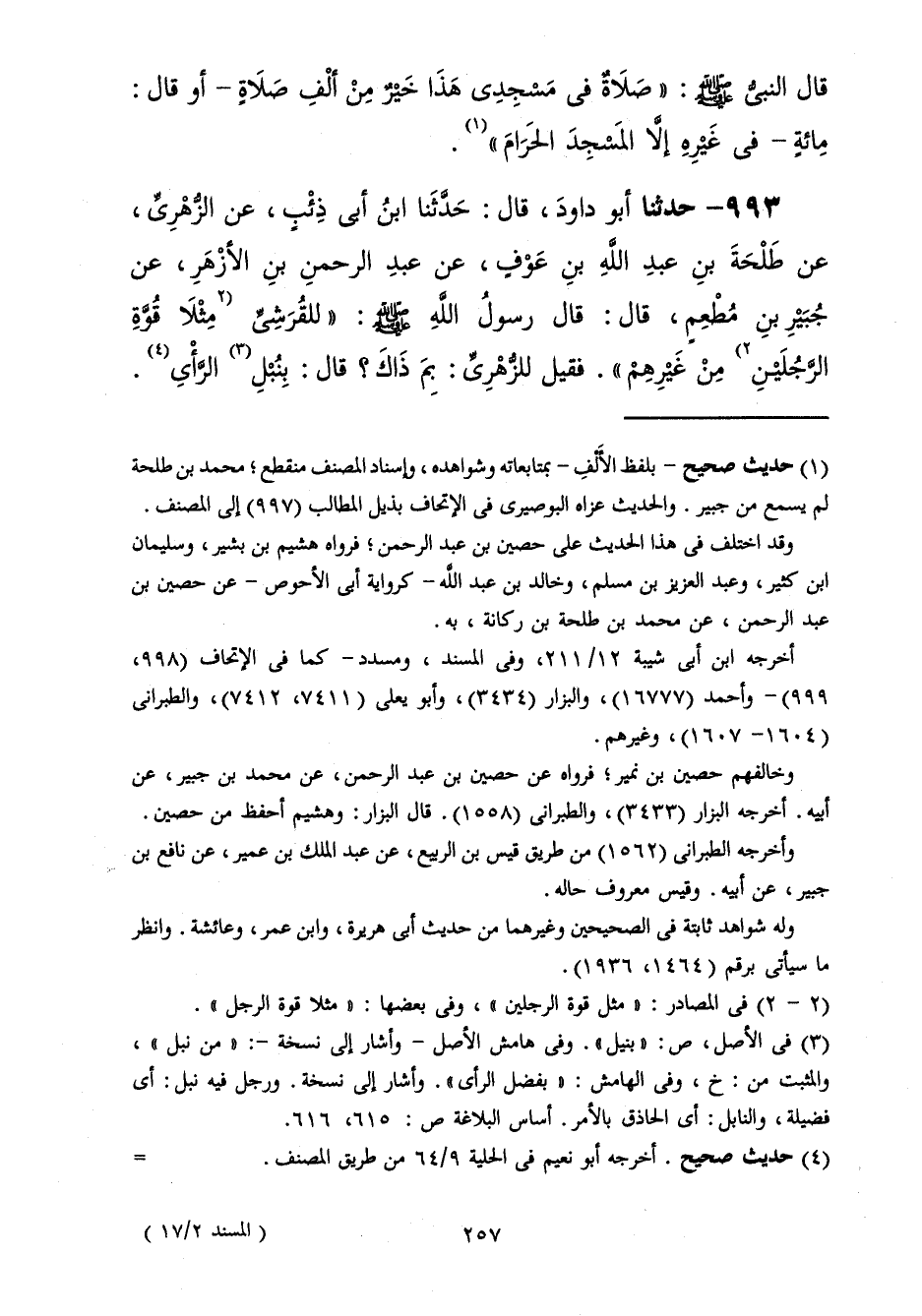 993 - حَدَّثَنَا أَبُو دَاوُدَ قَالَ: حَدَّثَنَا ابْنُ أَبِي ذِئْبٍ، عَنِ الزُّهْرِيِّ، عَنْ طَلْحَةَ بْنِ عَبْدِ اللَّهِ بْنِ عَوْفٍ، عَنْ عَبْدِ الرَّحْمَنِ بْنِ الْأَزْهَرِ، عَنْ جُبَيْرِ بْنِ مُطْعِمٍ، قَالَ: قَالَ رَسُولُ اللَّهِ صَلَّى اللهُ عَلَيْهِ وَسَلَّمَ: «§لِلْقُرَشِيِّ مِثْلَا قُوَّةِ الرَّجُلَيْنِ مِنْ غَيْرِهِمْ» فَقِيلَ لِلزُّهْرِيِّ: بِمَ ذَاكَ؟ قَالَ: «بِنُبْلِ الرَّأْيِ»