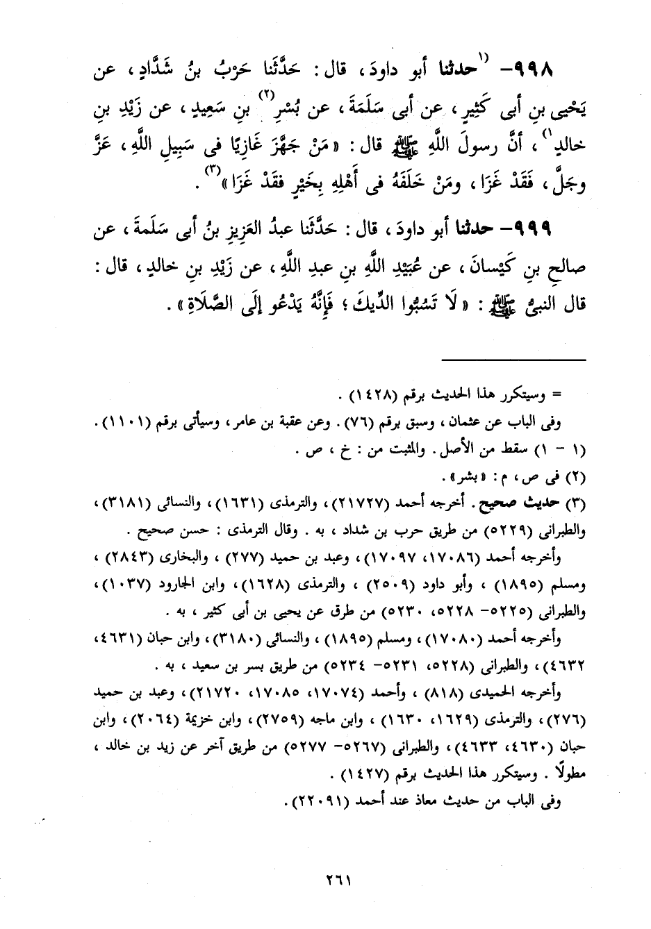 998 - حَدَّثَنَا أَبُو دَاوُدَ قَالَ: حَدَّثَنَا حَرْبُ بْنُ شَدَّادٍ، عَنْ يَحْيَى بْنِ أَبِي كَثِيرٍ، عَنْ أَبِي سَلَمَةَ، عَنْ بُسْرِ بْنِ سَعِيدٍ، عَنْ زَيْدِ بْنِ خَالِدٍ، أَنَّ رَسُولَ اللَّهِ صَلَّى اللهُ عَلَيْهِ وَسَلَّمَ قَالَ: «§مَنْ جَهَّزَ غَازِيًا فِي سَبِيلِ اللَّهِ عَزَّ وَجَلَّ فَقَدْ غَزَا وَمَنْ خَلَفَهُ فِي أَهْلِهِ بِخَيْرٍ فَقَدْ غَزَا»