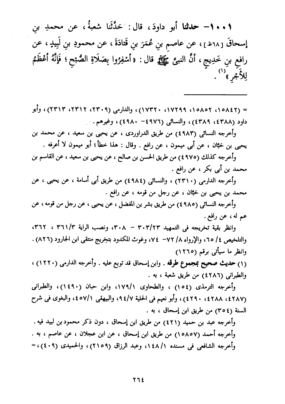 1001 - حَدَّثَنَا أَبُو دَاوُدَ قَالَ: حَدَّثَنَا شُعْبَةُ، عَنْ مُحَمَّدِ بْنِ إِسْحَاقَ، عَنْ عَاصِمِ بْنِ عُمَرَ بْنِ قَتَادَةَ، عَنْ مَحْمُودِ بْنِ لَبِيدٍ، عَنْ رَافِعِ بْنِ خَدِيجٍ، أَنَّ النَّبِيَّ صَلَّى اللهُ عَلَيْهِ وَسَلَّمَ قَالَ: «§أَسْفِرُوا بِصَلَاةِ الصُّبْحِ فَإِنَّهُ أَعْظَمُ لِلْأَجْرِ»