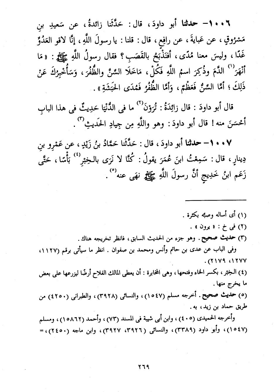 1006 - حَدَّثَنَا أَبُو دَاوُدَ قَالَ: حَدَّثَنَا زَائِدَةُ، عَنْ سَعِيدِ بْنِ مَسْرُوقٍ، عَنْ عَبَايَةَ عَنْ رَافِعٍ، قَالَ: قُلْنَا: يَا رَسُولَ اللَّهِ، إِنَّا لَاقُو الْعَدُوِّ غَدًا وَلَيْسَ مَعَنَا مُدًى أَفَنَذْبَحُ بِالْقَصَبِ فَقَالَ رَسُولُ اللَّهِ صَلَّى اللهُ عَلَيْهِ وَسَلَّمَ: «§مَا أَنْهَرَ الدَّمَ وَذُكِرَ اسْمُ اللَّهِ فَكُلْ مَا خَلَا السِّنَّ وَالظُّفُرَ، وَسَأُخْبِرُكَ عَنْ ذَلِكَ أَمَا السِّنُّ فَعَظْمٌ وَأَمَّا الظُّفُرُ فَمُدَى الْحَبَشَةِ» قَالَ أَبُو دَاوُدَ قَالَ زَائِدَةُ: تَرَوْنَ، مَا فِي الدُّنْيَا حَدِيثٌ فِي هَذَا الْبَابِ أَحْسَنُ مِنْهُ قَالَ أَبُو دَاوُدَ: وَهُوَ وَاللَّهِ مِنْ جِيَادِ الْحَدِيثِ