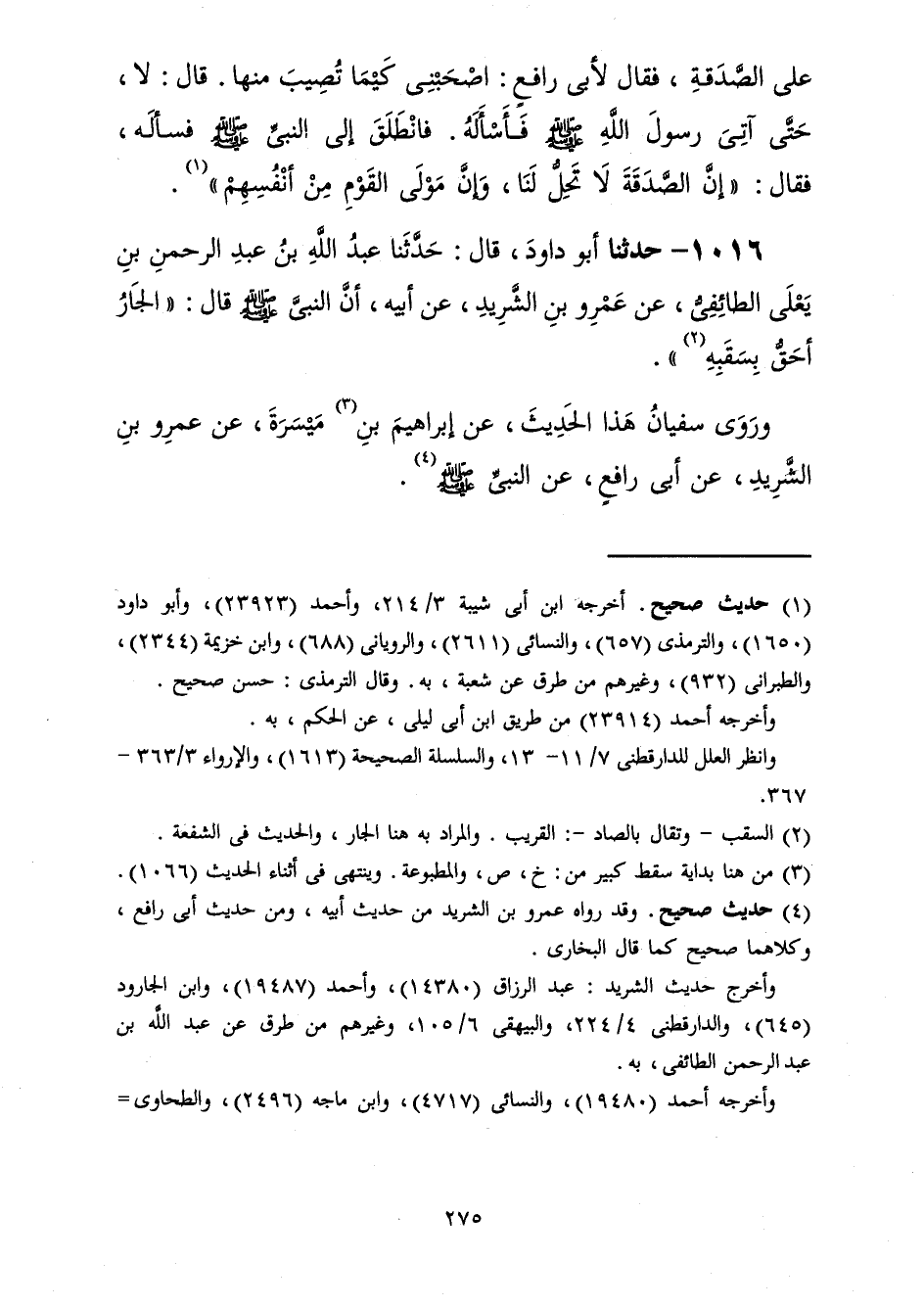 1016 - حَدَّثَنَا أَبُو دَاوُدَ قَالَ: حَدَّثَنَا عَبْدُ اللَّهِ بْنُ عَبْدِ الرَّحْمَنِ بْنِ يَعْلَى الطَّائِفِيُّ، عَنْ عَمْرِو بْنِ الشَّرِيدِ، عَنْ أَبِيهِ، أَنَّ النَّبِيَّ صَلَّى اللهُ عَلَيْهِ وَسَلَّمَ قَالَ: «§الْجَارُ أَحَقُّ بِسَقَبِهِ» وَرَوَى سُفْيَانُ هَذَا الْحَدِيثَ عَنْ إِبْرَاهِيمَ بْنِ مَيْسَرَةَ عَنْ عَمْرِو بْنِ الشَّرِيدِ عَنْ أَبِي رَافِعٍ عَنِ النَّبِيِّ صَلَّى اللهُ عَلَيْهِ وَسَلَّمَ