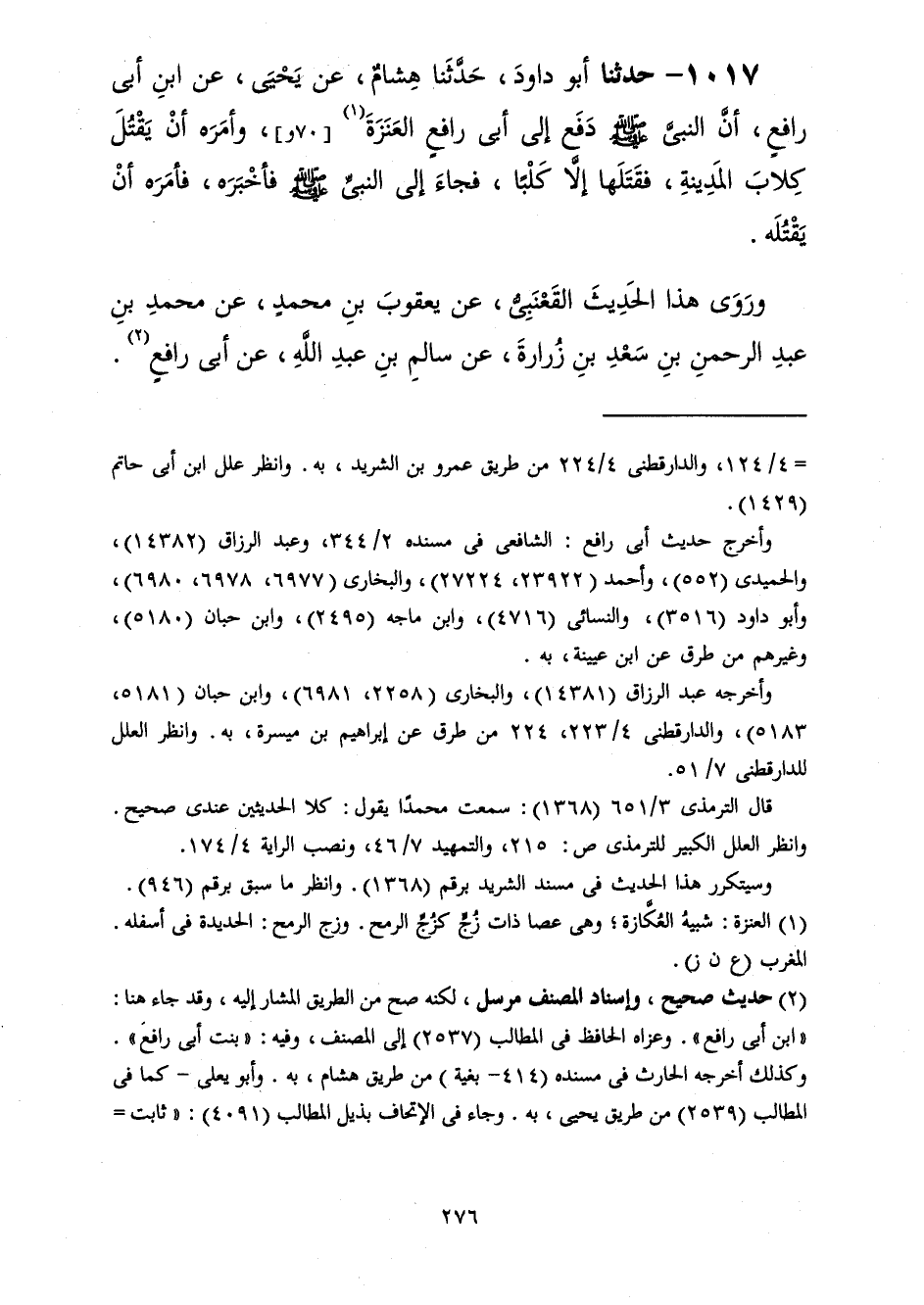 1017 - حَدَّثَنَا أَبُو دَاوُدَ قَالَ: حَدَّثَنَا هِشَامٌ، عَنْ يَحْيَى، عَنِ ابْنِ أَبِي رَافِعٍ، أَنَّ النَّبِيَّ صَلَّى اللهُ عَلَيْهِ وَسَلَّمَ «§دَفَعَ إِلَى أَبِي رَافِعٍ الْعَنَزَةَ، وَأَمَرَهُ أَنْ يَقْتُلَ كِلَابَ الْمَدِينَةِ» ؟ فَقَتَلَهَا إِلَّا كَلْبًا، فَجَاءَ إِلَى النَّبِيِّ صَلَّى اللهُ عَلَيْهِ وَسَلَّمَ فَأَخْبَرَهُ، «فَأَمَرَهُ أَنْ يَقْتُلَهُ» وَرَوَى هَذَا الْحَدِيثَ الْقَعْنَبِيُّ، عَنْ يَعْقُوبَ بْنِ مُحَمَّدٍ، عَنْ مُحَمَّدِ بْنِ عَبْدِ الرَّحْمَنِ بْنِ سَعْدِ بْنِ زُرَارَةَ، عَنْ سَالِمِ بْنِ عَبْدِ اللَّهِ، عَنْ أَبِي رَافِعٍ