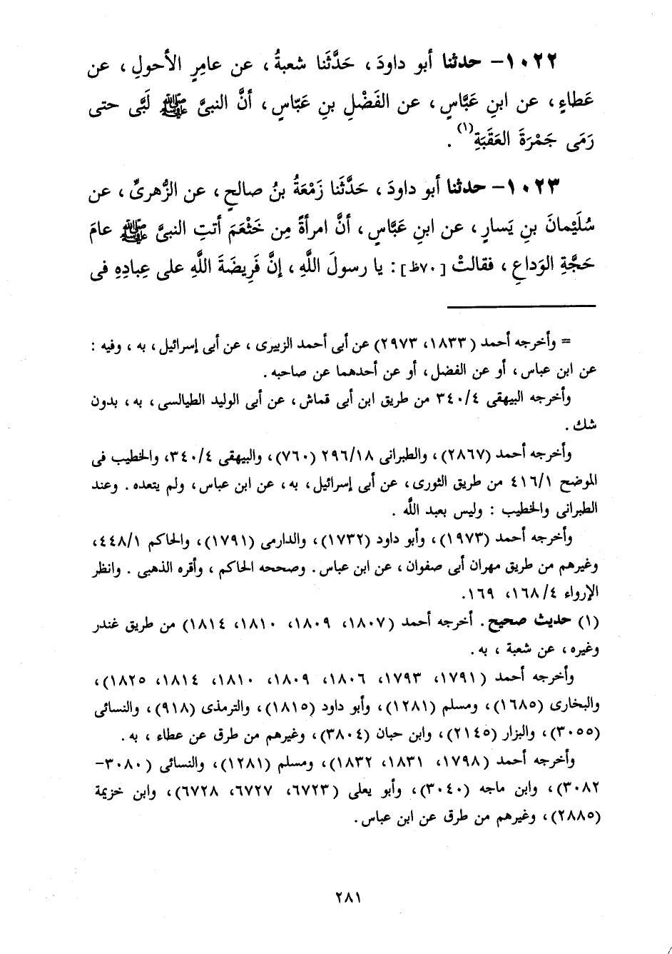 1022 - حَدَّثَنَا أَبُو دَاوُدَ، حَدَّثَنَا شُعْبَةُ، عَنْ عَامِرٍ الْأَحْوَلِ، عَنْ عَطَاءٍ، عَنِ ابْنِ عَبَّاسٍ، عَنِ الْفَضْلِ بْنِ عَبَّاسٍ، أَنَّ النَّبِيَّ صَلَّى اللهُ عَلَيْهِ وَسَلَّمَ «§لَبَّى حَتَّى رَمَى جَمْرَةَ الْعَقَبَةِ»
