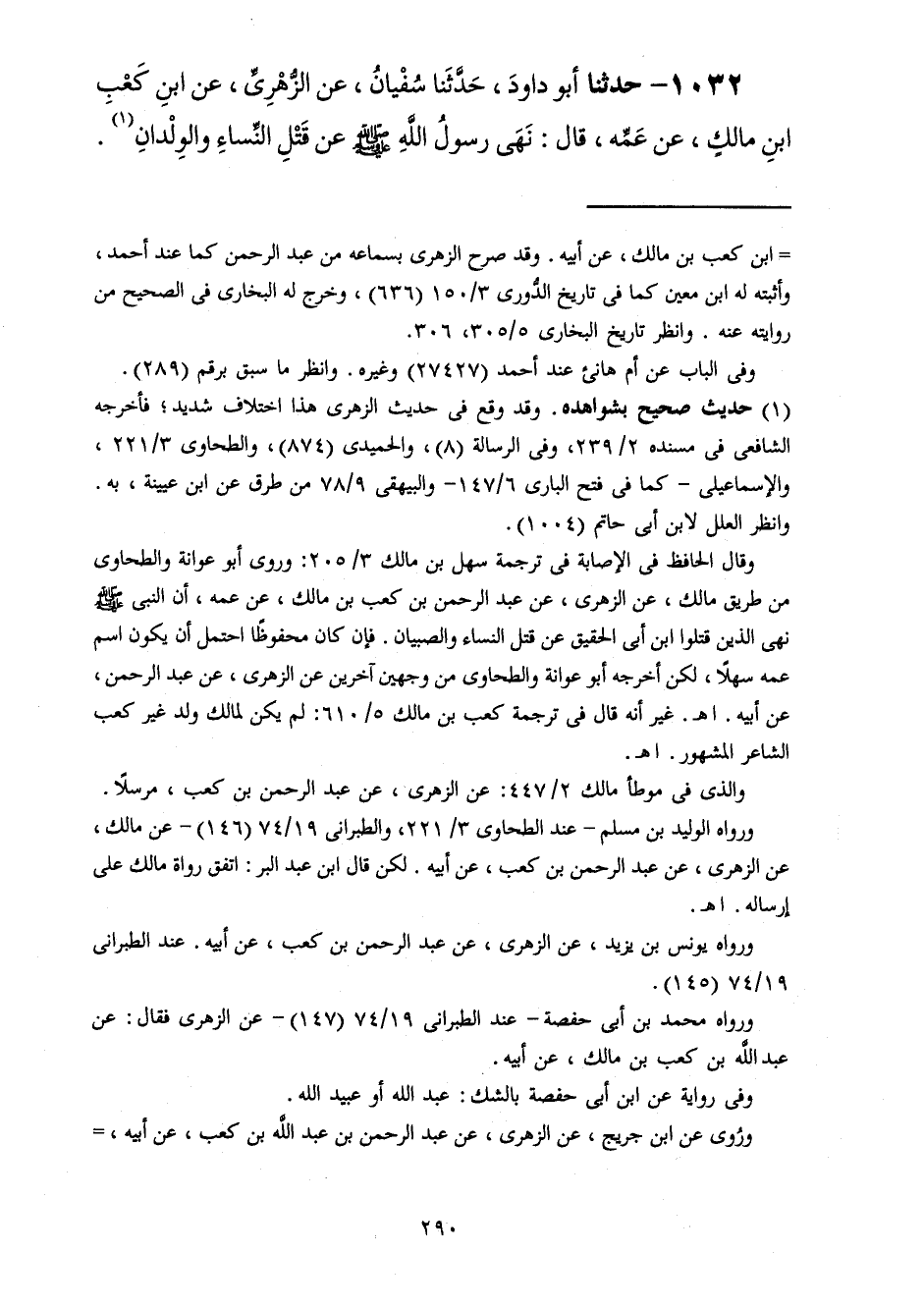 1032 - حَدَّثَنَا أَبُو دَاوُدَ، حَدَّثَنَا سُفْيَانُ، عَنِ الزُّهْرِيِّ، عَنِ ابْنِ كَعْبِ بْنِ مَالِكٍ، عَنْ عَمِّهِ، قَالَ: «§نَهَى رَسُولُ اللَّهِ صَلَّى اللهُ عَلَيْهِ وَسَلَّمَ عَنْ قَتْلِ النِّسَاءِ وَالْوِلْدَانِ»