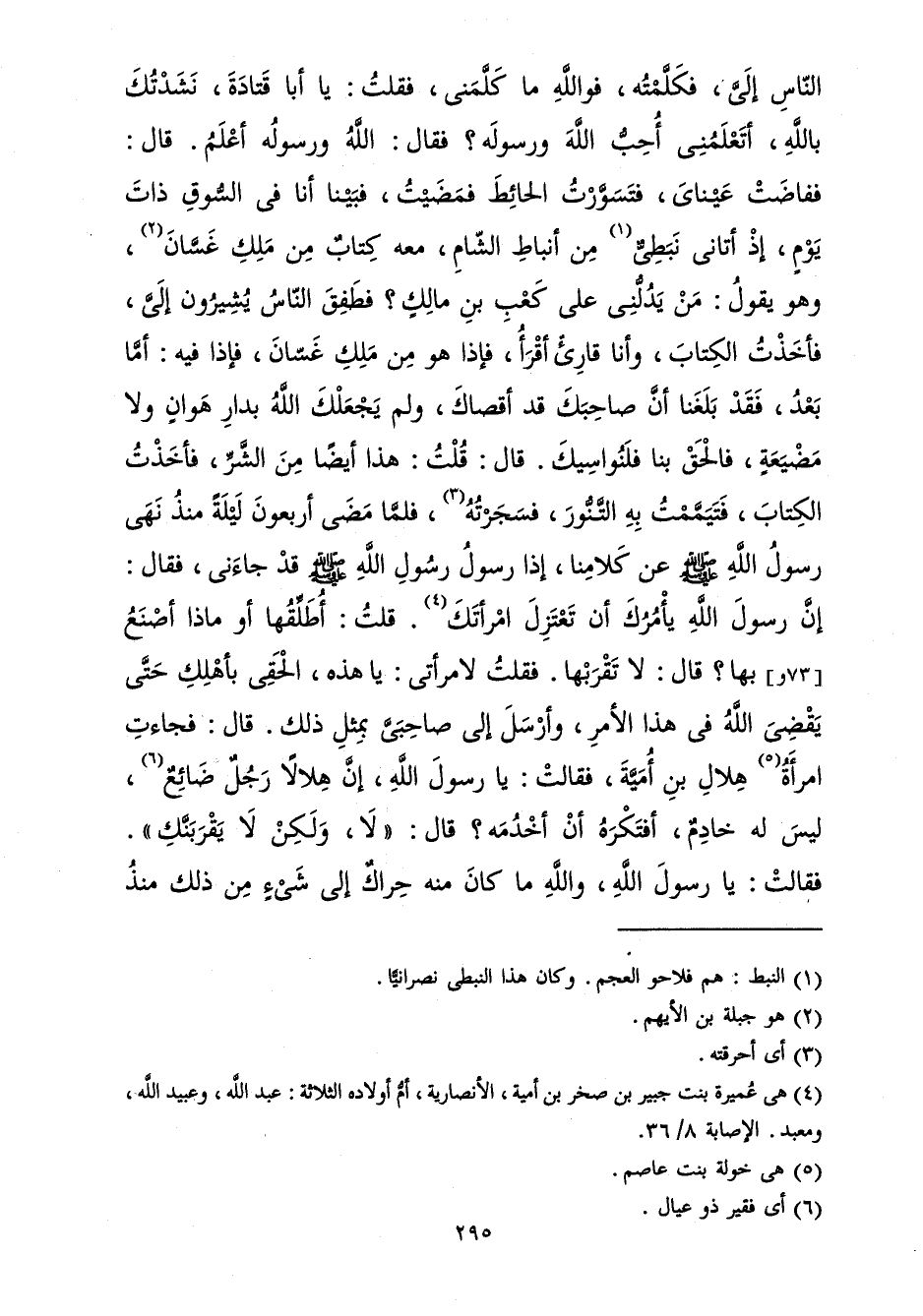 فَطَفِقَ النَّاسُ يُشِيرُونَ إِلَيَّ، فَأَخَذْتُ الْكِتَابَ، وَأَنَا قَارِئٌ أَقْرَأُ، فَإِذَا هُوَ مِنْ مَلِكِ غَسَّانَ، فَإِذَا فِيهِ: أَمَّا بَعْدُ، فَقَدْ بَلَغَنَا أَنَّ صَاحِبَكَ قَدْ أَقْصَاكَ، وَلَمْ يَجْعَلْكَ اللهُ بِدَارِ هَوَانٍ وَلاَ مَضْيَعَةٍ، فَالْحَقْ بِنَا فَلَنَوَاسِيَكَ، قَالَ: قُلْتُ: هَذَا أَيْضًا مِنَ الشَّرِّ، فَأَخَذْتُ الْكِتَابَ، فَتَيَمَّمْتُ بِهِ التَّنُّورَ، فَسَجَرْتُهُ، فَلَمَّا مَضَى أَرْبَعُونَ لَيْلَةً مُنْذُ نَهَى رَسُولُ اللهِ صَلَّى الله عَلَيْهِ وَسَلَّمَ عَنْ كَلاَمِنَا، إِذَا رَسُولُ رَسُولِ اللهِ صَلَّى الله عَلَيْهِ وَسَلَّمَ قَدْ جَاءَنِي، فَقَالَ: إِنَّ رَسُولَ اللهِ صَلَّى الله عَلَيْهِ وَسَلَّمَ يَأْمُرُكَ أَنْ تَعْتَزِلَ امْرَأَتَكَ، قُلْتُ: أُطَلِّقُهَا، أَوْ مَاذَا أَصْنَعُ بِهَا؟ قَالَ: لاَ تَقْرَبْهَا، فَقُلْتُ لاِمْرَأَتِي: يَا هَذِهِ، الْحَقِي بِأَهْلِكِ حَتَّى يَقْضِيَ اللهُ فِي هَذَا الأَمْرِ، وَأَرْسَلَ إِلَى صَاحِبَيَّ بِمِثْلِ ذَلِكَ، قَالَ: فَجَاءَتِ امْرَأَةُ هِلاَلِ بْنِ أُمَيَّةَ، فَقَالَتْ: يَا رَسُولَ اللهِ، إِنَّ هِلاَلاً رَجُلٌ ضَائِعٌ، لَيْسَ لَهُ خَادِمٌ، أَفَتَكْرَهُ أَنْ أَخْدُمَهُ؟ قَالَ: لاَ، وَلَكِنْ لاَ يَقْرَبَنَّكِ، فَقَالَتْ: يَا رَسُولَ اللهِ، وَاللهِ مَا كَانَ مِنْهُ حِرَاكٌ إِلَى شَيْءٍ مِنْ ذَلِكَ مُنْذُ كَانَ مِنْ أَمْرِهِ مَا كَانَ، إِنَّمَا هُوَ يَبْكِي، فَقَالَ لِي بَعْضُ أَهْلِي: وَمَا عَلَيْكَ أَنْ تَسْتَأْذِنَ فِي أَهْلِكَ رَسُولَ اللهِ صَلَّى الله عَلَيْهِ وَسَلَّمَ، فَقَدْ أَذِنَ لاِمْرَأَةِ هِلاَلٍ، فَقُلْتُ: وَاللهِ لاَ أَفْعَلُ، وَأَنَا رَجُلٌ شَابٌّ، لاَ أَدْرِي مَا يَقُولُ رَسُولُ اللهِ صَلَّى الله عَلَيْهِ وَسَلَّمَ،
