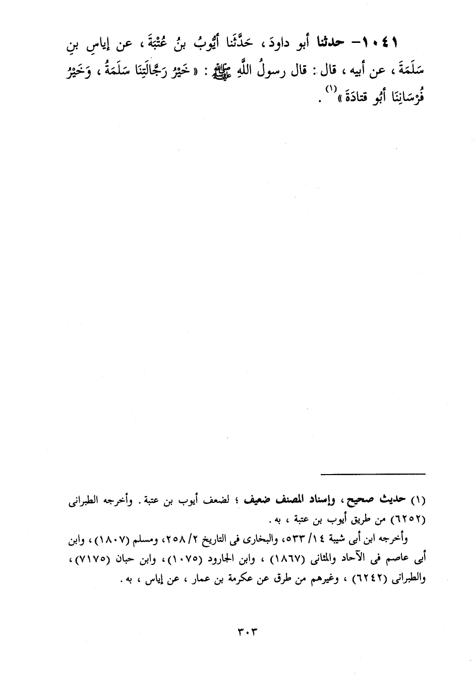 1041 - حَدَّثَنَا أَبُو دَاوُدَ، حَدَّثَنَا أَيُّوبُ بْنُ عُتْبَةَ، عَنْ إِيَاسِ بْنِ سَلَمَةَ، عَنْ أَبِيهِ، قَالَ: قَالَ رَسُولُ اللَّهِ صَلَّى اللهُ عَلَيْهِ وَسَلَّمَ: «§خَيْرُ رَجَّالَتِنَا سَلَمَةُ، وَخَيْرُ فُرْسَانِنَا أَبُو قَتَادَةَ»