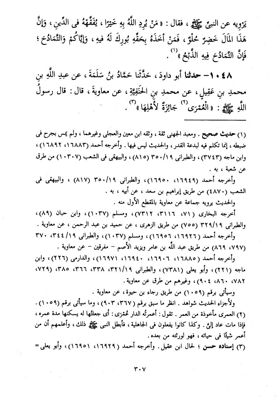 1048 - حَدَّثَنَا أَبُو دَاوُدَ، حَدَّثَنَا حَمَّادُ بْنُ سَلَمَةَ، عَنْ عَبْدِ اللَّهِ بْنِ مُحَمَّدِ بْنِ عَقِيلٍ، عَنْ مُحَمَّدِ بْنِ الْحَنَفِيَّةِ، عَنْ مُعَاوِيَةَ، قَالَ: قَالَ رَسُولُ اللَّهِ صَلَّى اللهُ عَلَيْهِ وَسَلَّمَ: «§الْعُمْرَى جَائِزَةٌ لِأَهْلِهَا»