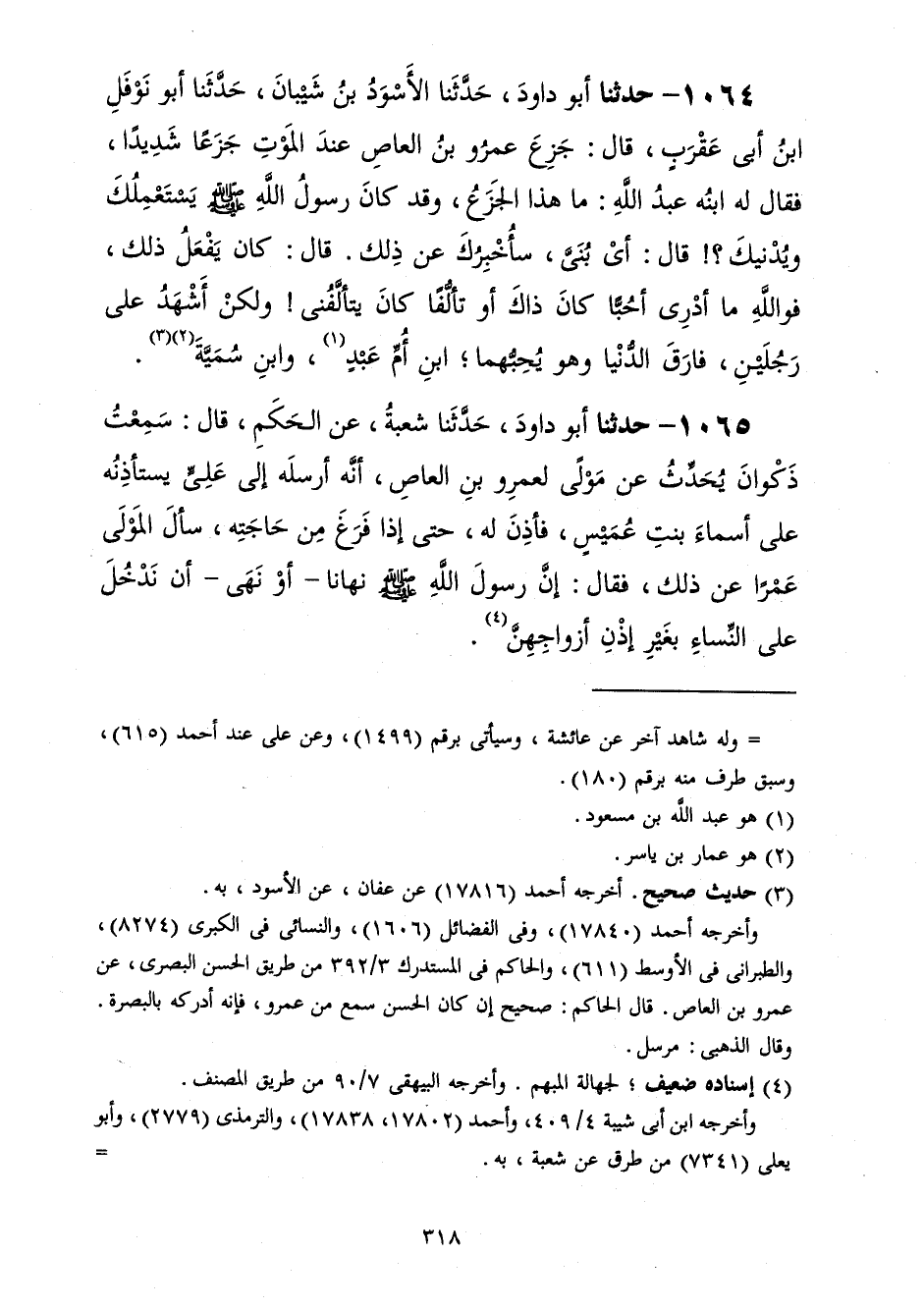 1064 - حَدَّثَنَا أَبُو دَاوُدَ، حَدَّثَنَا الْأَسْوَدُ بْنُ شَيْبَانَ، حَدَّثَنَا أَبُو نَوْفَلِ بْنُ أَبِي عَقْرَبٍ، قَالَ: جَزِعَ عَمْرُو بْنُ الْعَاصِ عِنْدَ الْمَوْتِ جَزَعًا شَدِيدًا، فَقَالَ لَهُ ابْنُهُ عَبْدُ اللَّهِ: مَا هَذَا الْجَزَعُ وَقَدْ «كَانَ رَسُولُ اللَّهِ صَلَّى اللهُ عَلَيْهِ وَسَلَّمَ يَسْتَعْمِلُكَ وَيُدْنِيكَ؟» قَالَ: أَيْ بُنَيَّ، سَأُخْبِرُكَ عَنْ ذَلِكَ، قَالَ: كَانَ يَفْعَلُ ذَلِكَ، فَوَاللَّهِ مَا أَدْرِي أَحُبًّا كَانَ ذَاكَ أَوْ تَأَلُّفًا كَانَ يَتَأَلَّفُنِي، وَلَكِنْ أَشْهَدُ عَلَى §رَجُلَيْنِ فَارَقَ الدُّنْيَا وَهُوَ يُحِبُّهُمَا: ابْنُ أُمِّ عَبْدٍ، وَابْنُ سُمَيَّةَ "
