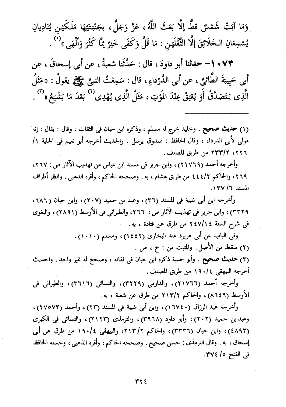 1073 - حَدَّثَنَا أَبُو دَاوُدَ قَالَ: حَدَّثَنَا شُعْبَةُ، عَنْ أَبِي إِسْحَاقَ، عَنْ أَبِي حَبِيبَةَ الطَّائِيِّ، عَنْ أَبِي الدَّرْدَاءِ، قَالَ: سَمِعْتُ النَّبِيَّ صَلَّى اللهُ عَلَيْهِ وَسَلَّمَ يَقُولُ: «§مَثَلُ الَّذِي يَتَصَدَّقُ أَوْ يُعْتِقُ عِنْدَ الْمَوْتِ مَثَلُ الَّذِي يُهْدِي بَعْدَ مَا يَشْبَعُ»