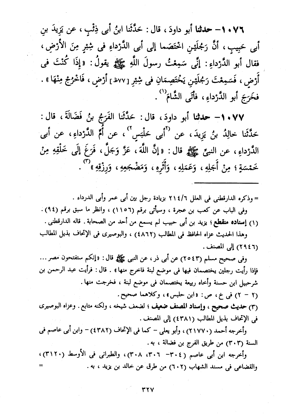 1076 - حَدَّثَنَا أَبُو دَاوُدَ قَالَ: حَدَّثَنَا ابْنُ أَبِي ذِئْبٍ، عَنْ يَزِيدَ بْنِ أَبِي حَبِيبٍ، أَنَّ رَجُلَيْنِ اخْتَصَمَا إِلَى أَبِي الدَّرْدَاءِ فِي شِبْرٍ مِنَ الْأَرْضِ، فَقَالَ أَبُو الدَّرْدَاءِ: إِنِّي سَمِعْتُ رَسُولَ اللَّهِ صَلَّى اللهُ عَلَيْهِ وَسَلَّمَ يَقُولُ: «§إِذَا كُنْتَ فِي أَرْضٍ، فَسَمِعْتَ رَجُلَيْنِ يَخْتَصِمَانِ فِي شِبْرِ أَرْضٍ فَاخْرُجْ مِنْهَا» فَخَرَجَ أَبُو الدَّرْدَاءِ فَأَتَى الشَّامَ