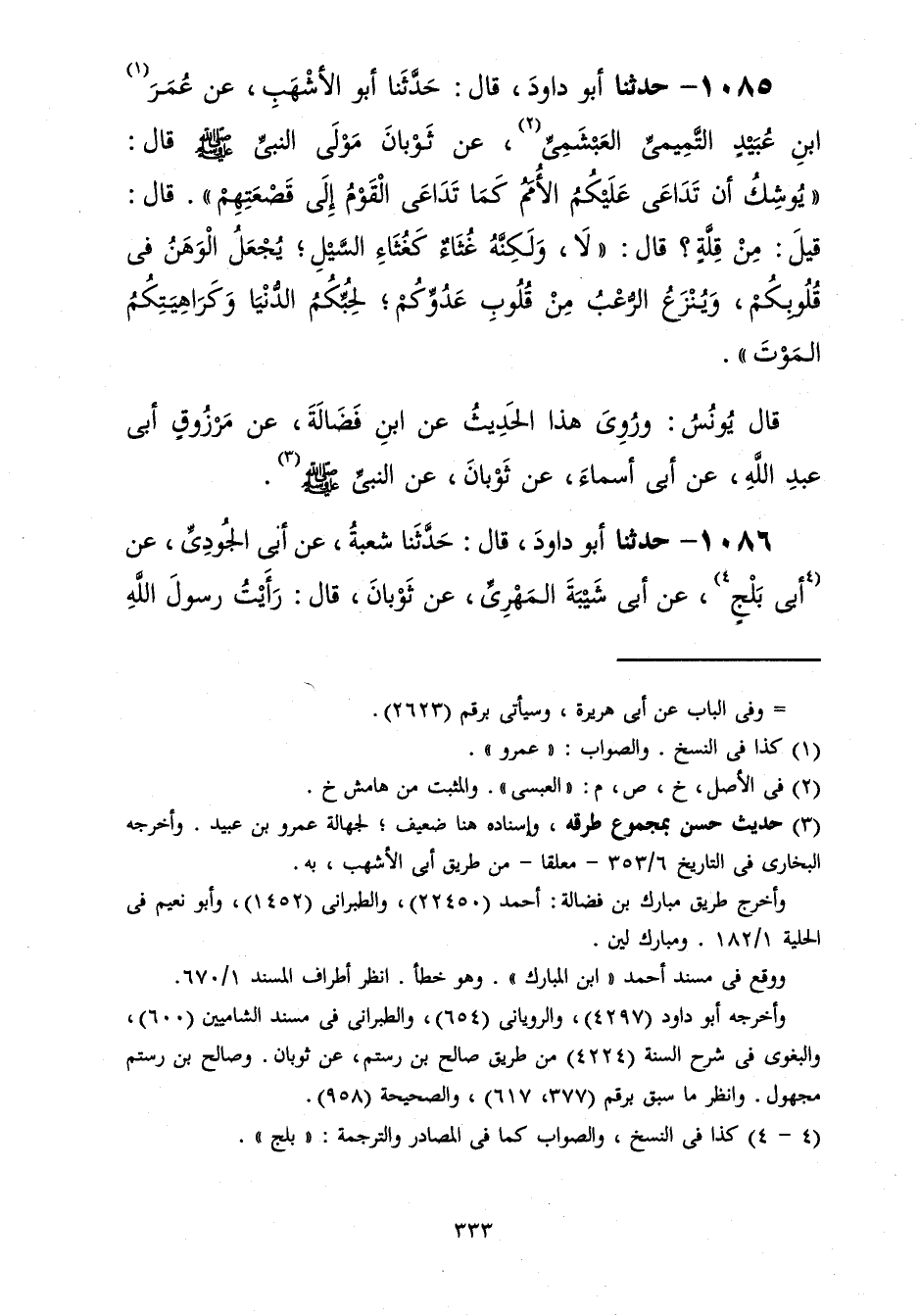 1085 - حَدَّثَنَا أَبُو دَاوُدَ قَالَ: حَدَّثَنَا أَبُو الْأَشْهَبِ، عَنْ عُمَرَ بْنِ عُبَيْدٍ التَّمِيمِيِّ الْعَبْشَمِيِّ، عَنْ ثَوْبَانَ مَوْلَى النَّبِيِّ صَلَّى اللهُ عَلَيْهِ وَسَلَّمَ قَالَ: «§يُوشِكُ أَنْ تَدَاعَى عَلَيْكُمُ الْأُمَمُ كَمَا تَدَاعَى الْقَوْمُ إِلَى قَصْعَتِهِمْ» قَالَ: قِيلَ: مِنْ قِلَّةٍ؟ قَالَ: «لَا وَلَكِنَّهُ غُثَاءٌ كَغُثَاءِ السَّيْلِ يُجْعَلُ الْوَهَنُ فِي قُلُوبِكُمْ، وَيُنْزَعُ الرُّعْبُ مِنْ قُلُوبِ عَدُوِّكُمْ لِحُبِّكُمُ الدُّنْيَا وَكَرَاهِيَتِكُمُ الْمَوْتَ» قَالَ يُونُسُ: وَرُوِيَ هَذَا الْحَدِيثُ عَنِ ابْنِ فَضَالَةَ عَنْ مَرْزُوقٍ أَبِي عَبْدِ اللَّهِ عَنْ أَبِي أَسْمَاءَ عَنْ ثَوْبَانَ عَنِ النَّبِيِّ صَلَّى اللهُ عَلَيْهِ وَسَلَّمَ