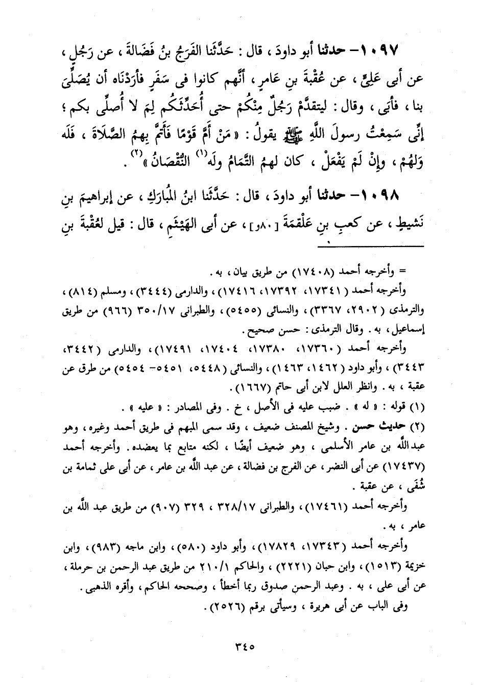 1097 - حَدَّثَنَا أَبُو دَاوُدَ قَالَ: حَدَّثَنَا الْفَرَجُ بْنُ فَضَالَةَ، عَنْ رَجُلٍ، عَنْ أَبِي عَلِيٍّ، عَنْ عُقْبَةَ بْنِ عَامِرٍ، أَنَّهُمْ كَانُوا فِي سَفَرٍ فَأَرَدْنَاهُ أَنْ يُصَلِّيَ بِنَا فَأَبَى وَقَالَ: لِيَتَقَدَّمْ رَجُلٌ مِنْكُمْ حَتَّى أُحَدِّثَكُمْ لِمَ لَا أُصَلِّي بِكُمْ؛ إِنِّي سَمِعْتُ رَسُولَ اللَّهِ صَلَّى اللهُ عَلَيْهِ وَسَلَّمَ يَقُولُ: «§مَنْ أَمَّ قَوْمًا فَأَتَمَّ بِهِمُ الصَّلَاةَ فَلَهُ وَلَهُمْ وَإِنْ لَمْ يَفْعَلْ كَانَ لَهُمُ التَّمَامُ وَلَهُ النُّقْصَانُ»