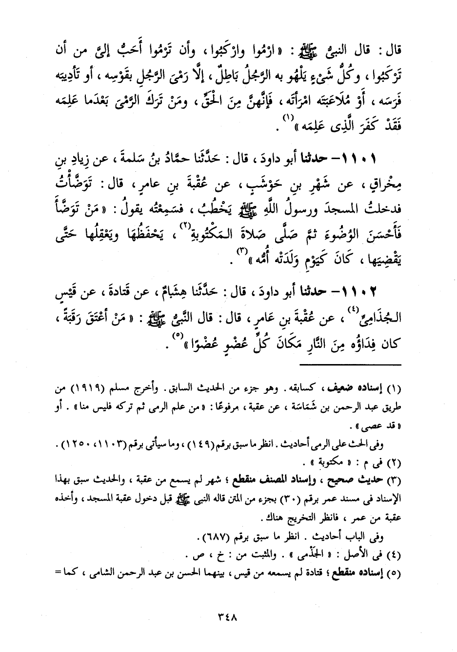1101 - حَدَّثَنَا أَبُو دَاوُدَ قَالَ: حَدَّثَنَا حَمَّادُ بْنُ سَلَمَةَ، عَنْ زِيَادِ بْنِ مِخْرَاقٍ، عَنْ شَهْرِ بْنِ حَوْشَبٍ، عَنْ عُقْبَةَ بْنِ عَامِرٍ، قَالَ: تَوَضَّأْتُ فَدَخَلْتُ الْمَسْجِدَ وَرَسُولُ اللَّهِ صَلَّى اللهُ عَلَيْهِ وَسَلَّمَ يَخْطُبُ فَسَمِعْتُهُ يَقُولُ: «§مَنْ تَوَضَّأَ فَأَحْسَنَ الْوُضُوءَ، ثُمَّ صَلَّى صَلَاةَ الْمَكْتُوبَةِ يَحْفَظُهَا وَيَعْقِلُهَا حَتَّى يَقْضِيَهَا كَانَ كَيَوْمِ وَلَدَتْهُ أُمُّهُ»