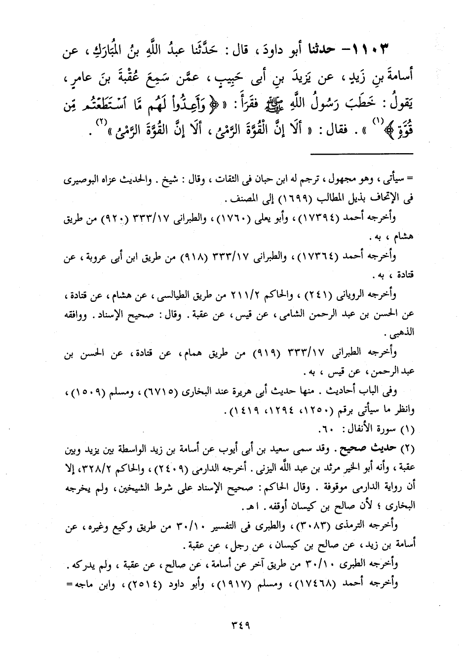 1103 - حَدَّثَنَا أَبُو دَاوُدَ قَالَ: حَدَّثَنَا عَبْدُ اللَّهِ بْنُ الْمُبَارَكِ، عَنْ أُسَامَةَ بْنِ زَيْدٍ، عَنْ يَزِيدَ بْنِ أَبِي حَبِيبٍ، عَمَّنْ سَمِعَ عُقْبَةَ بْنَ عَامِرٍ، يَقُولُ: خَطَبَ رَسُولُ اللَّهِ صَلَّى اللهُ عَلَيْهِ وَسَلَّمَ فَقَرَأَ {وَأَعِدُّوا لَهُمْ مَا اسْتَطَعْتُمْ مِنْ قُوَّةٍ} [الأنفال: 60] فَقَالَ: «§أَلَا إِنَّ الْقُوَّةَ الرَّمْيُ أَلَا إِنَّ الْقُوَّةَ الرَّمْيُ»