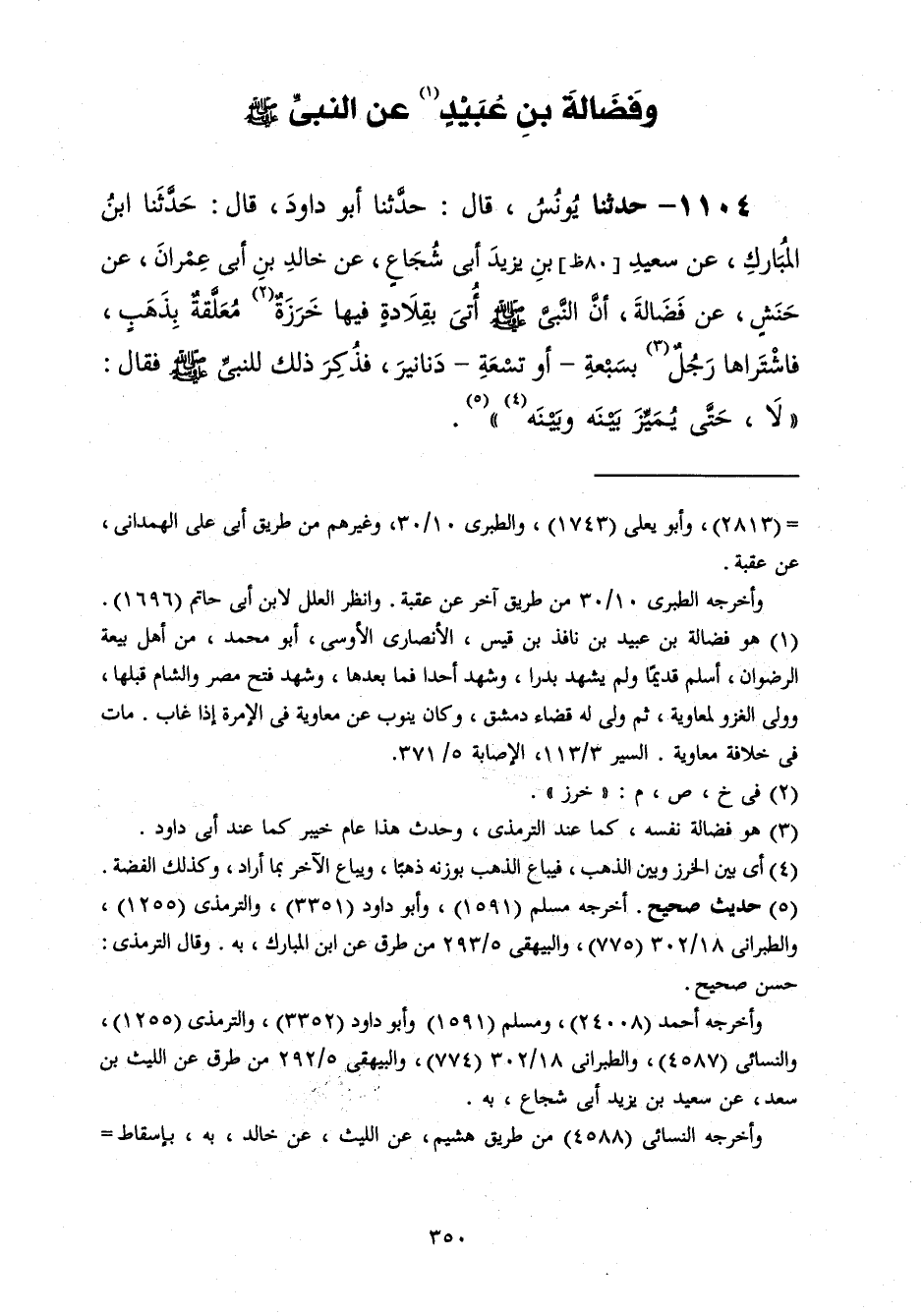 1104 - حَدَّثَنَا يُونُسُ قَالَ: حَدَّثَنَا أَبُو دَاوُدَ قَالَ: حَدَّثَنَا ابْنُ الْمُبَارَكِ، عَنْ سَعِيدِ بْنِ يَزِيدَ أَبِي شُجَاعٍ، عَنْ خَالِدِ بْنِ أَبِي عِمْرَانَ، عَنْ حَنَشٍ، عَنْ فَضَالَةَ، أَنَّ النَّبِيَّ صَلَّى اللهُ عَلَيْهِ وَسَلَّمَ §أُتِيَ بِقِلَادَةٍ فِيهَا خَرَزَةٌ مُعَلَّقَةٌ بِذَهَبٍ فَاشْتَرَاهَا رَجُلٌ بِسَبْعَةِ أَوْ تِسْعَةِ دَنَانِيرَ فَذُكِرَ ذَلِكَ لِلنَّبِيِّ صَلَّى اللهُ عَلَيْهِ وَسَلَّمَ فَقَالَ: «لَا حَتَّى يُمَيِّزَ بَيْنَهُ وَبَيْنَهُ»