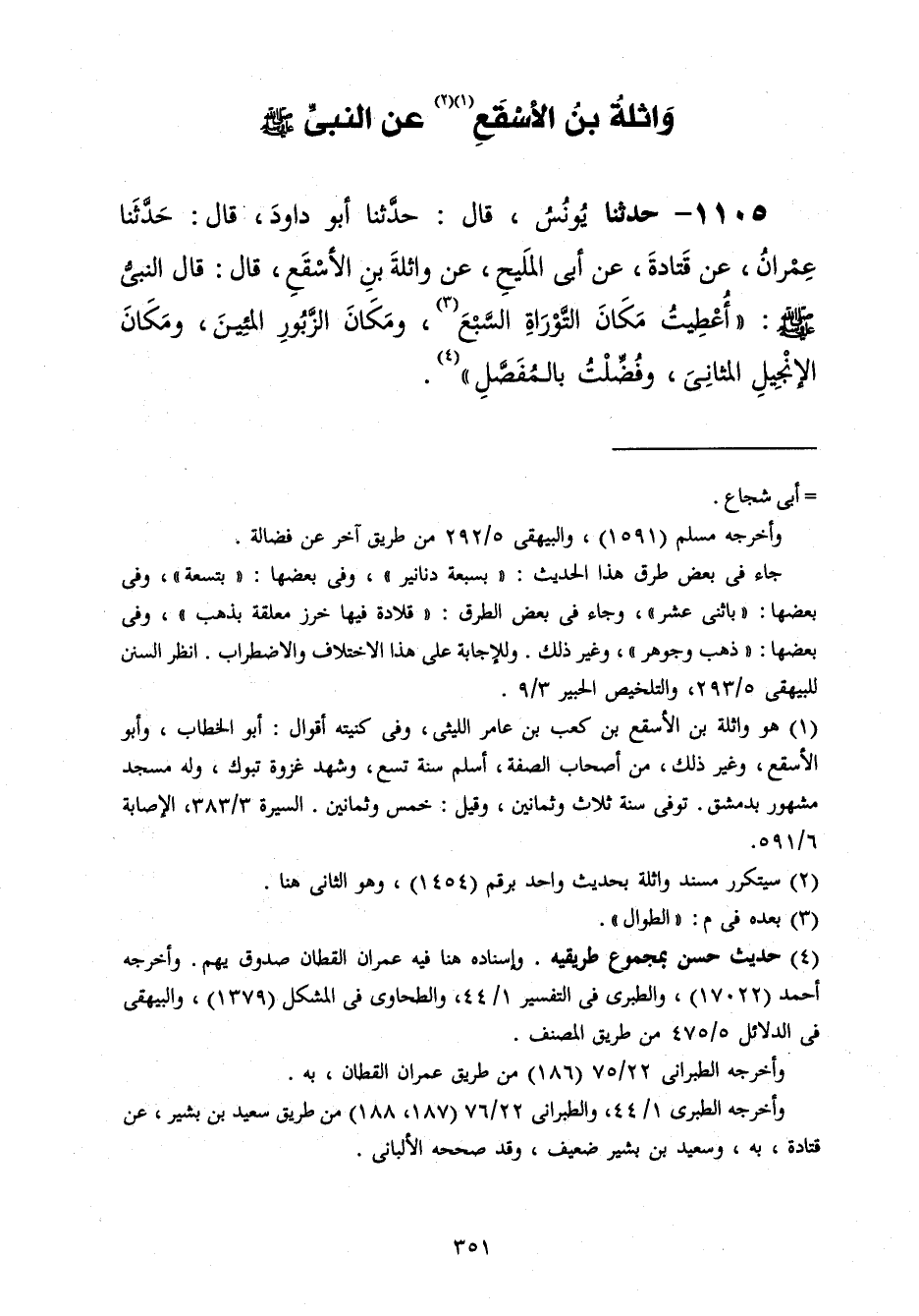 1105 - حَدَّثَنَا يُونُسُ قَالَ: حَدَّثَنَا أَبُو دَاوُدَ قَالَ: حَدَّثَنَا عِمْرَانُ، عَنْ قَتَادَةَ، عَنْ أَبِي الْمَلِيحِ، عَنْ وَاثِلَةَ بْنِ الْأَسْقَعِ، قَالَ: قَالَ النَّبِيُّ صَلَّى اللهُ عَلَيْهِ وَسَلَّمَ: «§أُعْطِيتُ مَكَانَ التَّوْرَاةِ السَّبْعَ وَمَكَانَ الزَّبُورِ الْمِئِينَ وَمَكَانَ الْإِنْجِيلِ الْمَثَانِيَ وَفُضِّلْتُ بِالْمُفَصَّلِ»