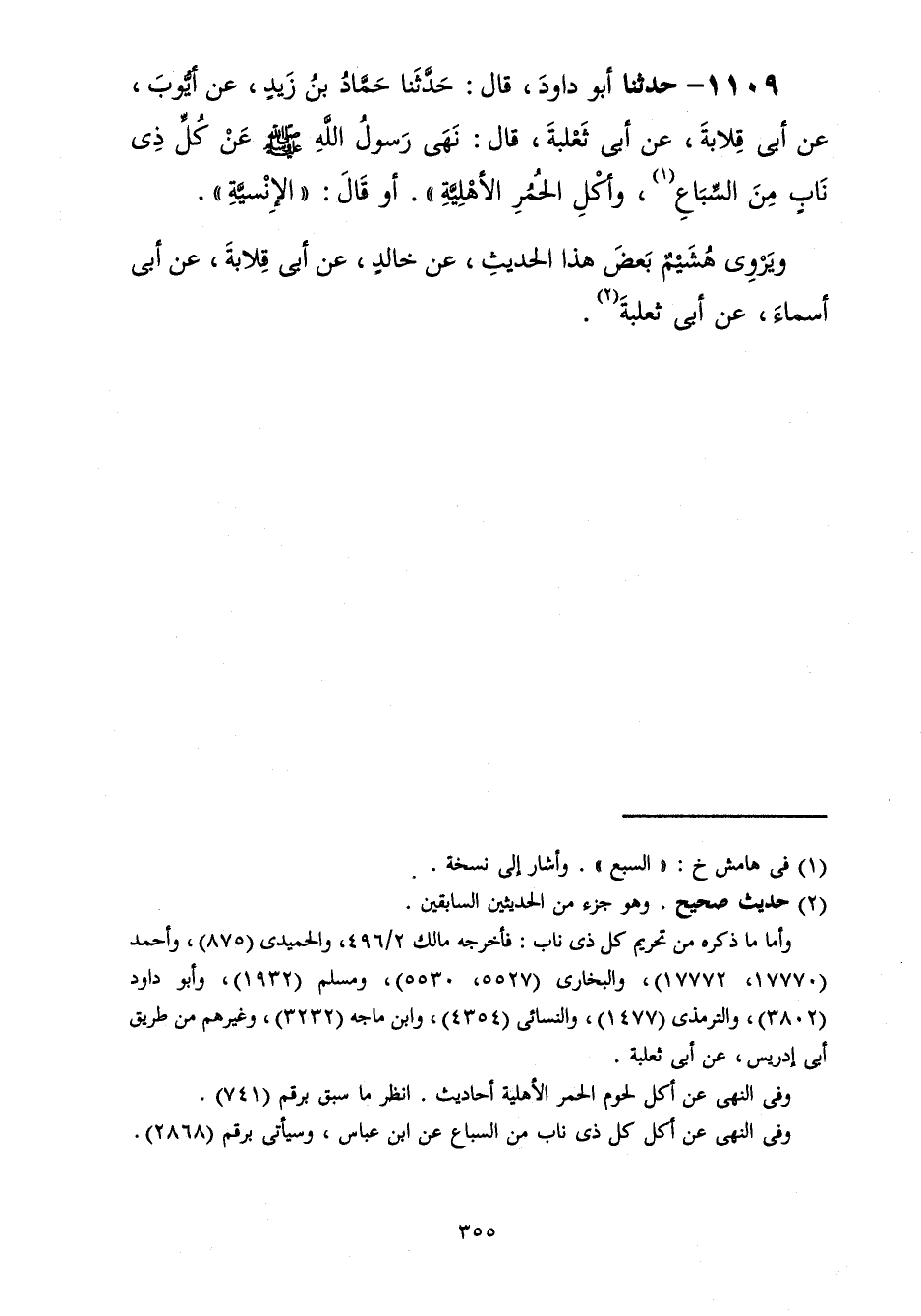 1109 - حَدَّثَنَا أَبُو دَاوُدَ قَالَ: حَدَّثَنَا حَمَّادُ بْنُ زَيْدٍ، عَنْ أَيُّوبَ، عَنْ أَبِي قِلَابَةَ، عَنْ أَبِي ثَعْلَبَةَ، قَالَ: «§نَهَى رَسُولُ اللَّهِ صَلَّى اللهُ عَلَيْهِ وَسَلَّمَ عَنْ كُلِّ ذِي نَابٍ مِنَ السِّبَاعِ، وَأَكْلِ الْحُمُرِ الْأَهْلِيَّةِ» أَوْ قَالَ: «الْإِنْسِيَّةِ» وَيَرْوِي هُشَيْمٌ بَعْضَ هَذَا الْحَدِيثِ عَنْ خَالِدٍ عَنْ أَبِي قِلَابَةَ عَنْ أَبِي أَسْمَاءَ عَنْ أَبِي ثَعْلَبَةَ