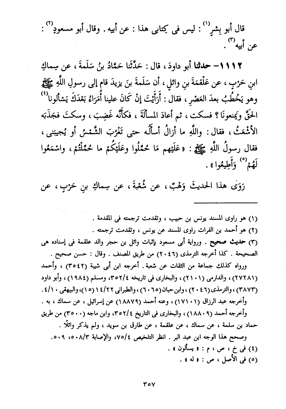 1112 - حَدَّثَنَا أَبُو دَاوُدَ قَالَ: حَدَّثَنَا حَمَّادُ بْنُ سَلَمَةَ، عَنْ سِمَاكِ بْنِ حَرْبٍ، عَنْ عَلْقَمَةَ بْنِ وَائِلٍ، أَنَّ سَلَمَةَ بْنَ يَزِيدَ، قَامَ إِلَى رَسُولِ اللَّهِ صَلَّى اللهُ عَلَيْهِ وَسَلَّمَ وَهُوَ يَخْطُبُ بَعْدَ الْعَصْرِ، فَقَالَ: أَرَأَيْتَ إِنْ كَانَ عَلَيْنَا أُمَرَاءُ بَعْدَكَ يَسْأَلُونَا الْحَقَّ وَيَمْنَعُونَا؟ فَسَكَتَ، ثُمَّ أَعَادَ الْمَسْأَلَةَ فَكَأَنَّهُ غَضِبَ، وَسَكَتَ فَجَذَبَهُ الْأَشْعَثُ فَقَالَ: وَاللَّهِ مَا أَزَالَ أَسْأَلُهُ حَتَّى تَغْرُبَ الشَّمْسُ أَوْ يُجِيبَنِي، فَقَالَ رَسُولُ اللَّهِ صَلَّى اللهُ عَلَيْهِ وَسَلَّمَ: «§عَلَيْهِمْ مَا حُمِّلُوا وَعَلَيْكُمْ مَا حُمِّلْتُمْ وَاسْمَعُوا لَهُمْ وَأَطِيعُوا» رَوَى هَذَا الْحَدِيثَ وَهْبٌ عَنْ شُعْبَةَ عَنْ سِمَاكِ بْنِ حَرْبٍ، عَنْ -[358]- عَلْقَمَةَ، عَنْ أَبِيهِ أَنَّ سَلَمَةَ بْنَ يَزِيدَ