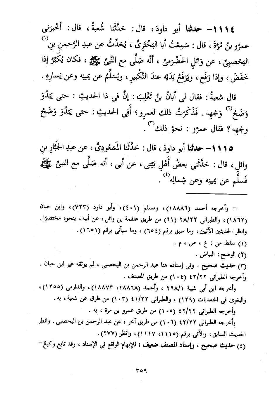 1114 - حَدَّثَنَا أَبُو دَاوُدَ قَالَ: حَدَّثَنَا شُعْبَةُ، قَالَ: أَخْبَرَنِي عَمْرُو بْنُ مُرَّةَ، قَالَ: سَمِعْتُ أَبَا الْبَخْتَرِيِّ، يُحَدِّثُ عَنْ عَبْدِ الرَّحْمَنِ بْنِ الْيَحْصِبِيِّ، عَنْ وَائِلٍ الْحَضْرَمِيِّ، أَنَّهُ صَلَّى مَعَ النَّبِيِّ صَلَّى اللهُ عَلَيْهِ وَسَلَّمَ «فَكَانَ §يُكَبِّرُ إِذَا خَفَضَ، وَإِذَا رَفَعَ وَيَرْفَعُ يَدَيْهِ عِنْدَ التَّكْبِيرِ وَيُسَلِّمُ عَنْ يَمِينِهِ وَعَنْ يَسَارِهِ» قَالَ شُعْبَةُ فَقَالَ لِي أَبَانُ بْنُ تَغْلِبَ: إِنَّ فِيَ ذَا الْحَدِيثِ حَتَّى يَبْدُوَ وَضَحُ وَجْهِهِ، فَذَكَرْتُ ذَلِكَ لِعَمْرٍو أَفِي الْحَدِيثِ حَتَّى يَبْدُوَ وَضَحُ وَجْهِهِ؟ فَقَالَ عَمْرٌو نَحْوَ ذَلِكَ