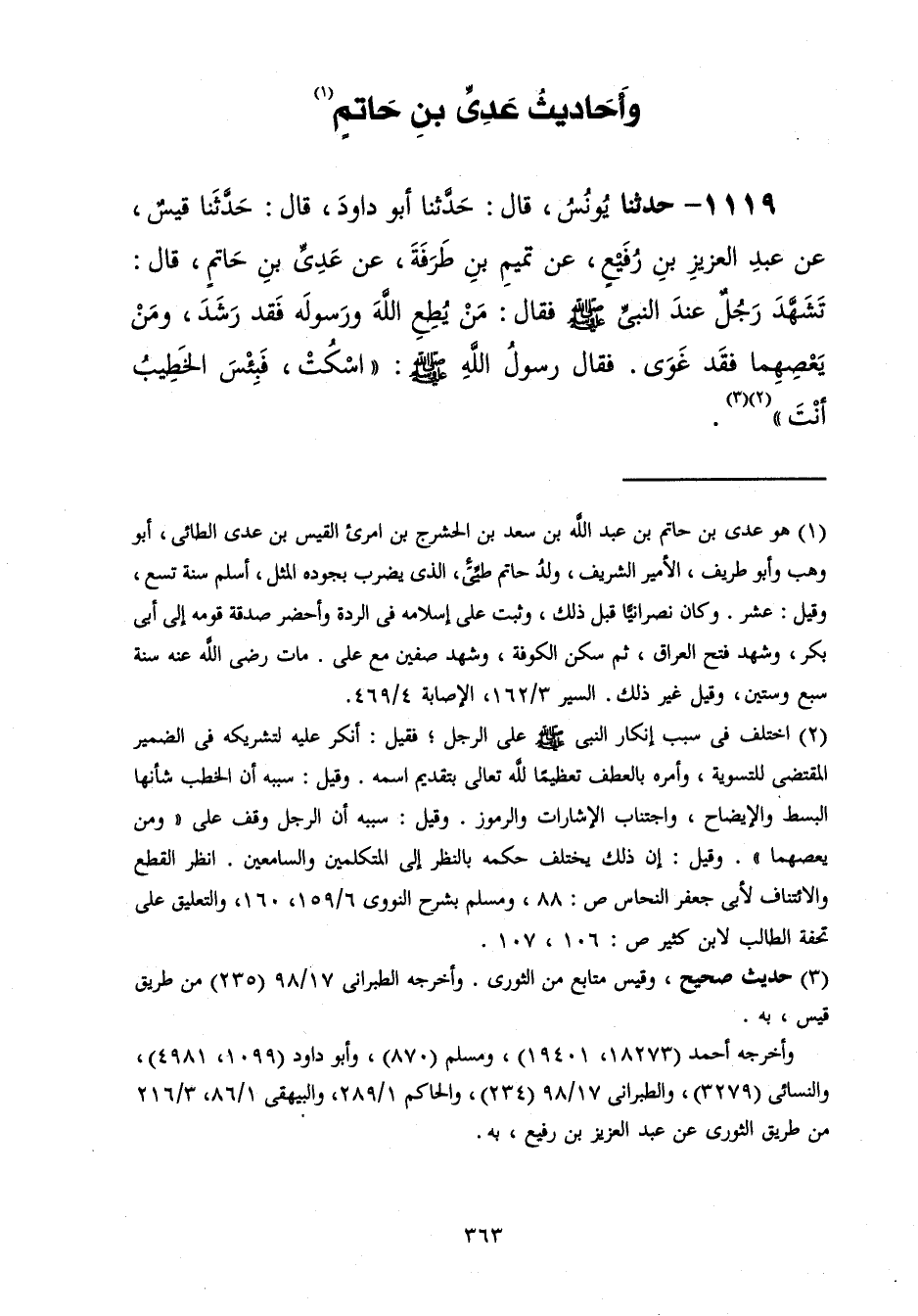 1119 - حَدَّثَنَا يُونُسُ قَالَ: حَدَّثَنَا أَبُو دَاوُدَ قَالَ: حَدَّثَنَا قَيْسٌ، عَنْ عَبْدِ الْعَزِيزِ بْنِ رُفَيْعٍ، عَنْ تَمِيمِ بْنِ طَرَفَةَ، عَنْ عَدِيِّ بْنِ حَاتِمٍ، قَالَ: تَشَهَّدَ رَجُلٌ عِنْدَ النَّبِيِّ صَلَّى اللهُ عَلَيْهِ وَسَلَّمَ، فَقَالَ: مَنْ يُطِعِ اللَّهَ وَرَسُولَهُ فَقَدْ رَشَدَ وَمَنْ يَعْصِهِمَا فَقَدْ غَوَى فَقَالَ رَسُولُ اللَّهِ صَلَّى اللهُ عَلَيْهِ وَسَلَّمَ: «§اسْكُتْ فَبِئْسَ الْخَطِيبُ أَنْتَ»