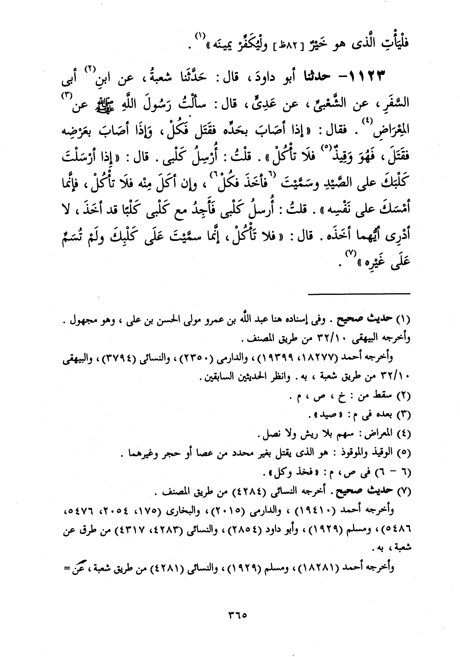 1123 - حَدَّثَنَا أَبُو دَاوُدَ قَالَ: حَدَّثَنَا شُعْبَةُ، عَنِ ابْنِ أَبِي السَّفَرِ، عَنِ الشَّعْبِيِّ، عَنْ عَدِيٍّ، قَالَ: §سَأَلْتُ رَسُولَ اللَّهِ صَلَّى اللهُ عَلَيْهِ وَسَلَّمَ عَنْ الْمِعْرَاضِ فَقَالَ: «إِذَا أَصَابَ بِحَدِّهِ فَقَتَلَ، فَكُلْ وَإِذَا أَصَابَ بِعَرْضِهِ فَقَتَلَ فَهُوَ وَقِيذٌ فَلَا تَأْكُلْ» قُلْتُ: أُرْسِلُ كَلْبِي قَالَ: «إِذَا أَرْسَلْتَ كَلْبَكَ عَلَى الصَّيْدِ وَسَمَّيْتَ فَأَخَذَ فَكُلْ وَإنْ أَكَلَ مِنْهُ فَلَا تَأْكُلْ فَإِنَّمَا أَمْسَكَ عَلَى نَفْسِهِ» : قُلْتُ أُرْسِلُ كَلْبِي فَأَجِدُ مَعَ كَلْبِي كَلْبًا قَدْ أَخَذَ لَا أَدْرِي أَيُّهُمَا أَخَذَهُ قَالَ: «فَلَا تَأْكُلْ؛ إِنَّمَا سَمَّيْتَ عَلَى كَلْبِكَ، وَلَمْ تُسَمِّ عَلَى غَيْرِهِ» -[366]-.