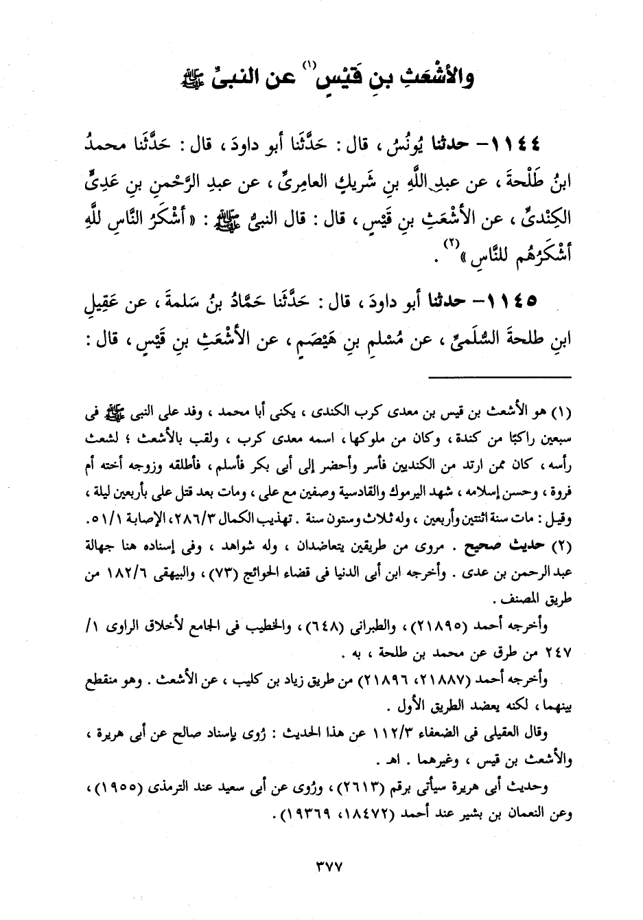 1144 - حَدَّثَنَا يُونُسُ قَالَ: حَدَّثَنَا أَبُو دَاوُدَ قَالَ: حَدَّثَنَا مُحَمَّدُ بْنُ طَلْحَةَ، عَنْ عَبْدِ اللَّهِ بْنِ شَرِيكٍ الْعَامِرِيِّ، عَنْ عَبْدِ الرَّحْمَنِ بْنِ عَدِيٍّ الْكِنْدِيِّ، عَنِ الْأَشْعَثِ بْنِ قَيْسٍ، قَالَ: قَالَ النَّبِيُّ صَلَّى اللهُ عَلَيْهِ وَسَلَّمَ: «§أَشْكَرُ النَّاسِ لِلَّهِ أَشْكَرُهُمْ لِلنَّاسِ»