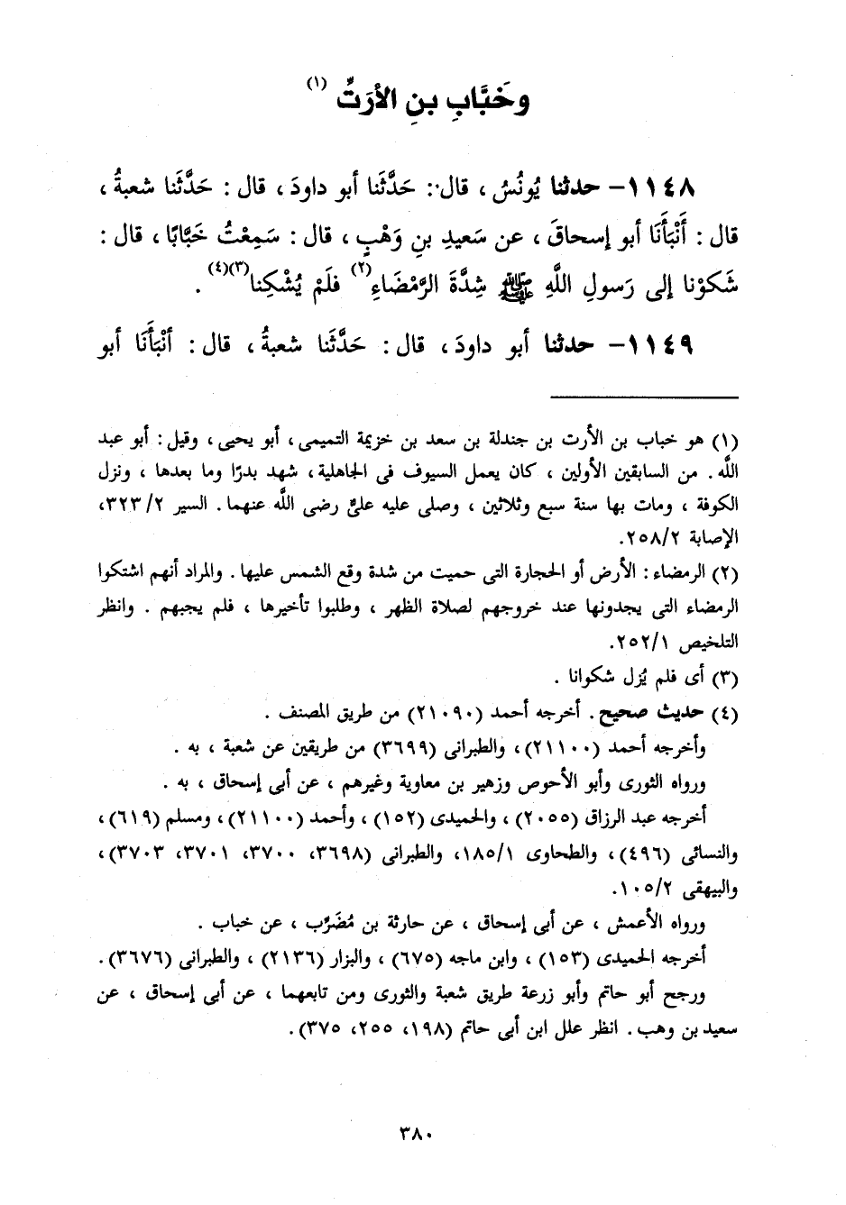 1148 - حَدَّثَنَا يُونُسُ قَالَ: حَدَّثَنَا أَبُو دَاوُدَ قَالَ: حَدَّثَنَا شُعْبَةُ، قَالَ: أَنْبَأَنَا أَبُو إِسْحَاقَ، عَنْ سَعِيدِ بْنِ وَهْبٍ، قَالَ: سَمِعْتُ خَبَّابًا، قَالَ: «§شَكَوْنَا إِلَى رَسُولِ اللَّهِ صَلَّى اللهُ عَلَيْهِ وَسَلَّمَ شِدَّةَ الرَّمْضَاءِ فَلَمْ يُشْكِنَا»
