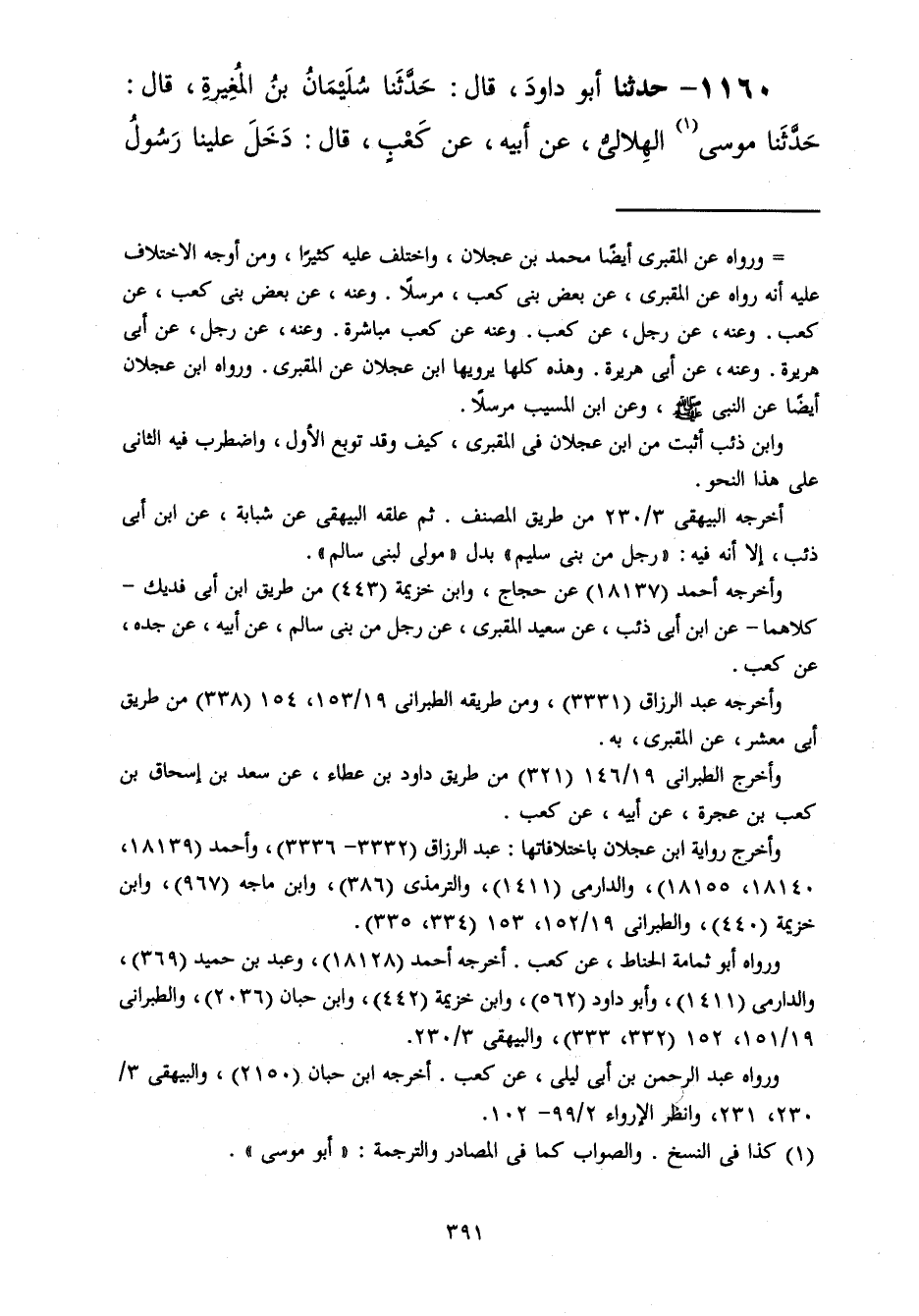 1160 - حَدَّثَنَا أَبُو دَاوُدَ قَالَ: حَدَّثَنَا سُلَيْمَانُ بْنُ الْمُغِيرَةِ، قَالَ: حَدَّثَنَا مُوسَى الْهِلَالِيُّ، عَنْ أَبِيهِ، عَنْ كَعْبٍ، قَالَ: دَخَلَ عَلَيْنَا رَسُولُ -[392]- اللَّهِ صَلَّى اللهُ عَلَيْهِ وَسَلَّمَ الْمَسْجِدَ، فَقَالَ: «مَنْ هَاهُنَا؟ هَلْ تَسْمَعُونَ؟ إِنَّهُ §يَكُونُ بَعْدِي أُمَرَاءُ يَعْمَلُونَ بِغَيْرِ طَاعَةِ اللَّهِ فَمَنْ شَارَكَهُمْ فِي عَمَلِهِمْ وَأعَانَهُمْ عَلَى ظُلْمِهِمْ فَلَيْسَ مِنِّي وَلَسْتُ مِنْهُ، وَمَنْ لَمْ يَشْرَكْهُمْ فِي عَمَلِهِمْ وَلَمْ يُعِنْهُمْ عَلَى ظُلْمِهِمْ فَهُوَ مِنِّي وَأَنَا مِنْهُ»