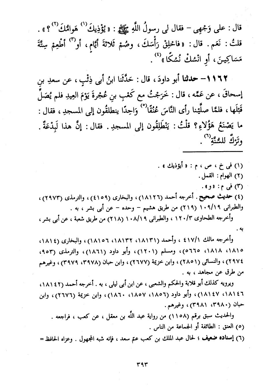 1162 - حَدَّثَنَا أَبُو دَاوُدَ قَالَ: حَدَّثَنَا ابْنُ أَبِي ذِئْبٍ، عَنْ سَعْدِ بْنِ إِسْحَاقَ، عَنْ عَمِّهِ، قَالَ: خَرَجْتُ مَعَ كَعْبِ بْنِ عُجْرَةَ يَوْمَ الْعِيدِ فَلَمْ يُصَلِّ قَبْلَهَا، فَلَمَّا صَلَّيْنَا رَأَى النَّاسَ عُنُقًا وَاحِدًا يَنْطَلِقُونَ إِلَى الْمَسْجِدِ فَقَالَ: «مَا يَصْنَعُ هَؤُلَاءِ؟» قُلْتُ: يَنْطَلِقُونَ إِلَى الْمَسْجِدِ فَقَالَ: «§إِنَّ هَذِهِ لَبِدْعَةٌ وَتَرْكٌ لِلسُّنَّةِ»