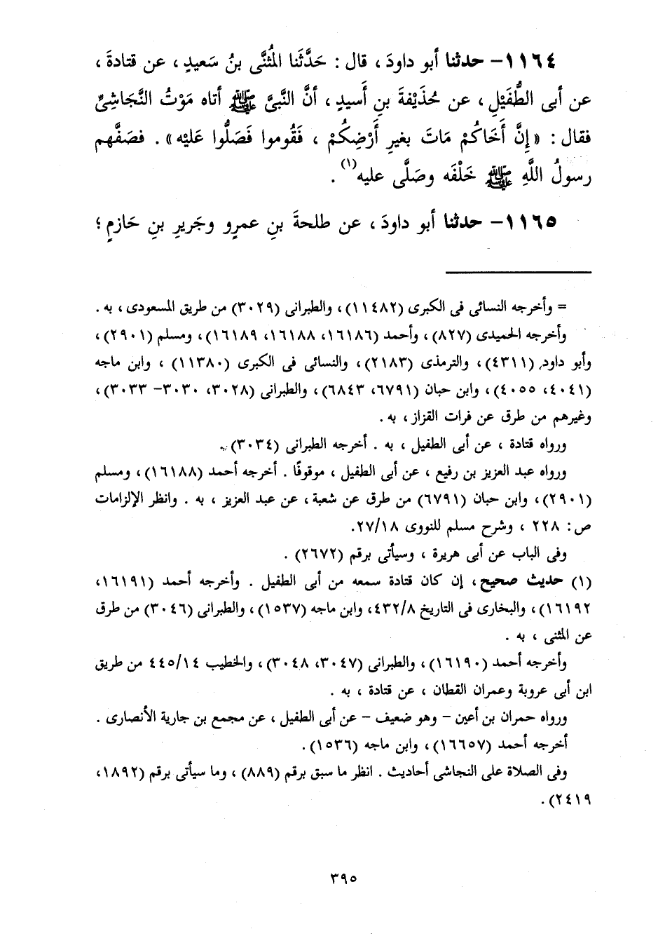 1164 - حَدَّثَنَا أَبُو دَاوُدَ قَالَ: حَدَّثَنَا الْمُثَنَّى بْنُ سَعِيدٍ، عَنْ قَتَادَةَ، عَنْ أَبِي الطُّفَيْلِ، عَنْ حُذَيْفَةَ بْنِ أَسِيدٍ، أَنَّ النَّبِيَّ صَلَّى اللهُ عَلَيْهِ وَسَلَّمَ أَتَاهُ مَوْتُ النَّجَاشِيِّ فَقَالَ: «إِنَّ §أَخَاكُمْ مَاتَ بِغَيْرِ أَرْضِكُمْ، فَقُومُوا فَصَلُّوا عَلَيْهِ» فَصَفَّهُمْ رَسُولُ اللَّهِ صَلَّى اللهُ عَلَيْهِ وَسَلَّمَ خَلْفَهُ وَصَلَّى عَلَيْهِ