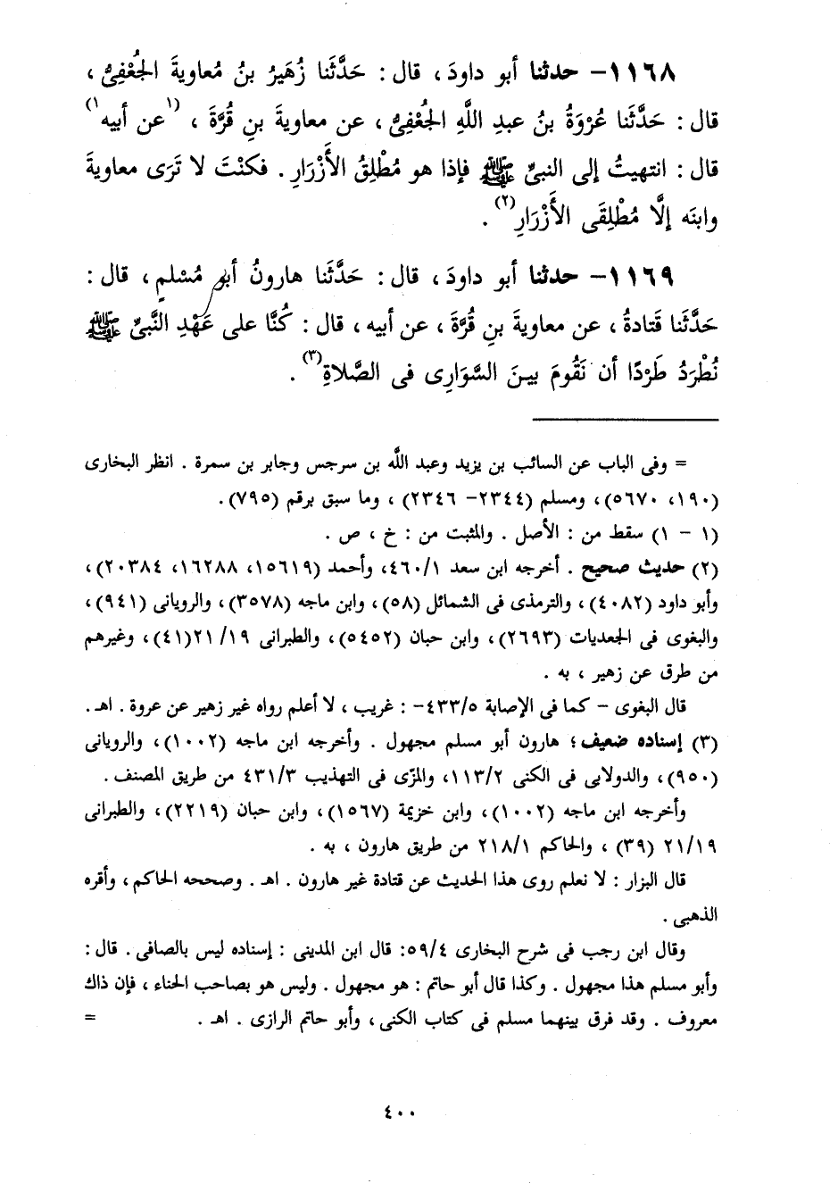 1168 - حَدَّثَنَا أَبُو دَاوُدَ قَالَ: حَدَّثَنَا زُهَيْرُ بْنُ مُعَاوِيَةَ الْجُعْفِيُّ، قَالَ: حَدَّثَنَا عُرْوَةُ بْنُ عَبْدِ اللَّهِ الْجُعْفِيُّ، عَنْ مُعَاوِيَةَ بْنِ قُرَّةَ، عَنْ أَبِيهِ، قَالَ: «انْتَهَيْتُ إِلَى النَّبِيِّ صَلَّى اللهُ عَلَيْهِ وَسَلَّمَ §فَإِذَا هُوَ مُطْلِقُ الْأَزْرَارِ» فَكُنْتَ لَا تَرَى مُعَاوِيَةَ وَابْنَهُ إِلَّا مُطْلِقَيِ الْأَزْرَارِ