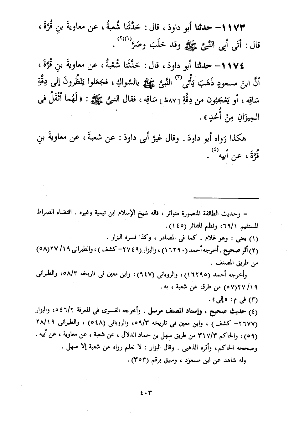 1174 - حَدَّثَنَا أَبُو دَاوُدَ قَالَ: حَدَّثَنَا شُعْبَةُ، عَنْ مُعَاوِيَةَ بْنِ قُرَّةَ، أَنَّ ابْنَ مَسْعُودٍ، ذَهَبَ يَأْتِي النَّبِيَّ صَلَّى اللهُ عَلَيْهِ وَسَلَّمَ بِالسِّوَاكِ، فَجَعَلُوا يَنْظُرُونَ إِلَى دِقَّةِ سَاقِهِ أَوْ يَعْجَبُونَ مِنْ دِقَّةِ سَاقِهِ فَقَالَ النَّبِيُّ صَلَّى اللهُ عَلَيْهِ وَسَلَّمَ: «§لَهُمَا أَثْقَلُ فِي الْمِيزَانِ مِنْ أُحُدٍ» هَكَذَا رَوَاهُ أَبُو دَاوُدَ وَقَالَ غَيْرُ أَبِي دَاوُدَ: عَنْ شُعْبَةَ عَنْ مُعَاوِيَةَ بْنِ قُرَّةَ عَنْ أَبِيهِ