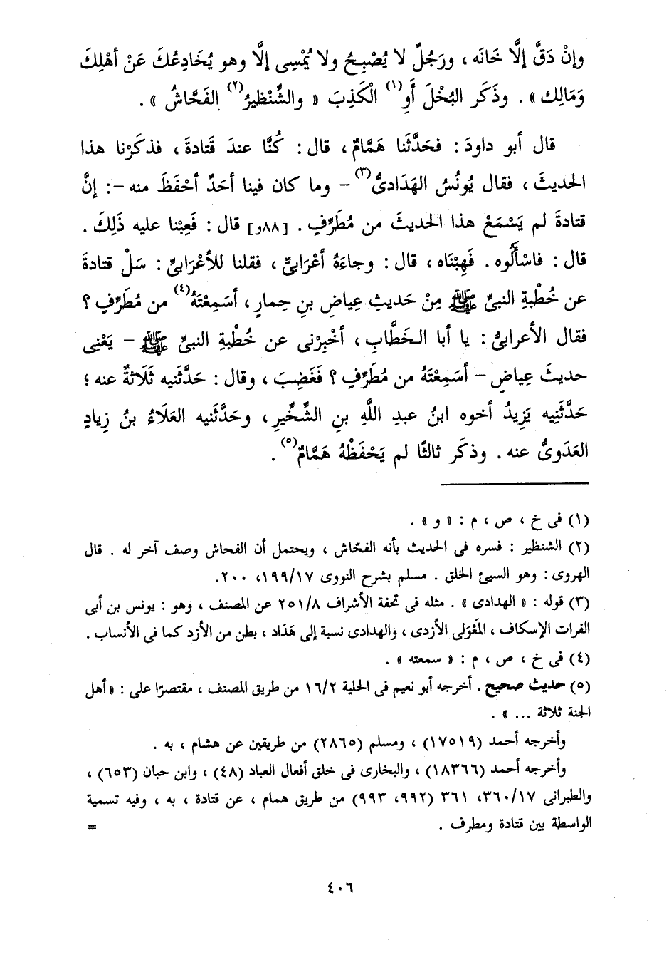 قَالَ أَبُو دَاوُدَ: فَحَدَّثَنَا هَمَّامٌ قَالَ: كُنَّا عِنْدَ قَتَادَةَ فَذَكَرْنَا هَذَا الْحَدِيثَ، فَقَالَ يُونُسُ الْهَدَادِيُّ وَمَا كَانَ فِينَا أَحَدٌ أَحْفَظَ مِنْهُ: إِنَّ قَتَادَةَ لَمْ يَسْمَعْ هَذَا الْحَدِيثَ مِنْ مُطَرِّفٍ، قَالَ: فَعِبْنَا عَلَيْهِ ذَلِكَ، قَالَ: فَاسْأَلُوهُ فَهِبْنَاهُ، قَالَ: وَجَاءَهُ أَعْرَابِيٌّ، فَقُلْنَا لِلأَعْرَابِيِّ: سَلْ قَتَادَةَ عَنْ خُطْبَةِ النَّبِيِّ صَلَّى الله عَلَيْهِ وَسَلَّمَ عَنْ حَدِيثِ عِيَاضِ بْنِ حِمَارٍ أَسَمِعْتَهُ مِنْ مُطَرِّفٍ؟ فَقَالَ الأَعْرَابِيُّ: يَا أَبَا الْخَطَّابِ أَخْبِرْنِي عَنُ خُطْبَةِ النَّبِيِّ صَلَّى الله عَلَيْهِ وَسَلَّمَ، يَعْنِي حَدِيثَ عِيَاضٍ أَسَمِعْتَهُ مِنْ مُطَرِّفٍ؟ فَغَضِبَ، وَقَالَ: حَدَّثَنِيهِ ثَلاَثَةٌ عَنْهُ، حَدَّثَنِيهِ يَزِيدُ أَخُوهُ ابْنُ عَبْدِ اللهِ بْنِ الشِّخِّيرِ، وَحَدَّثَنِيهِ الْعَلاَءُ بْنُ زِيَادٍ الْعَدَوِيُّ عَنْهُ، وَذَكَرَ ثَالِثًا لَمْ يَحْفَظْهُ هَمَّامٌ.
